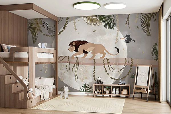 Fototapety Maľba lode na hore so stromami a horami v pozadí