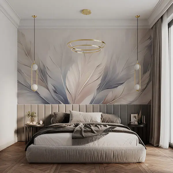 Tlmené tóny, akvarel, fototapeta s pierkami do spálne bez ostrých kontrastov. Hľadajte pokojné rytmy a jemné prechody. Pri umeleckom poňatí zvažte abstraktné fototapety s pierkami alebo svetelné scenérie.