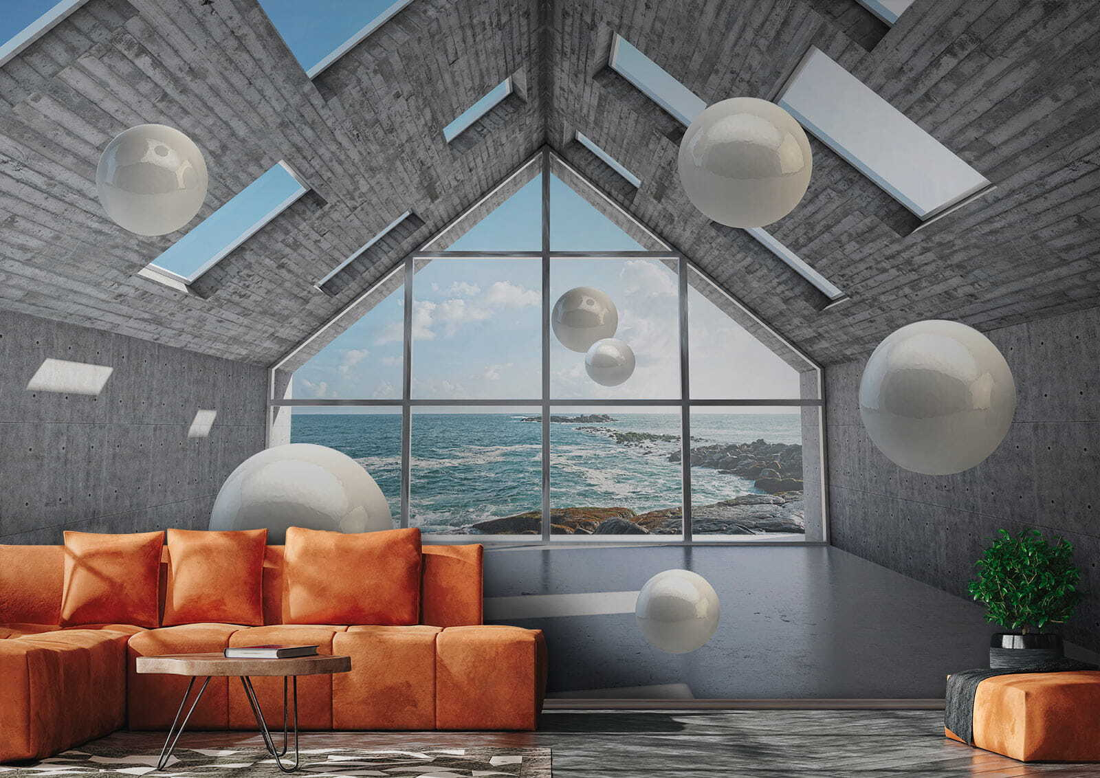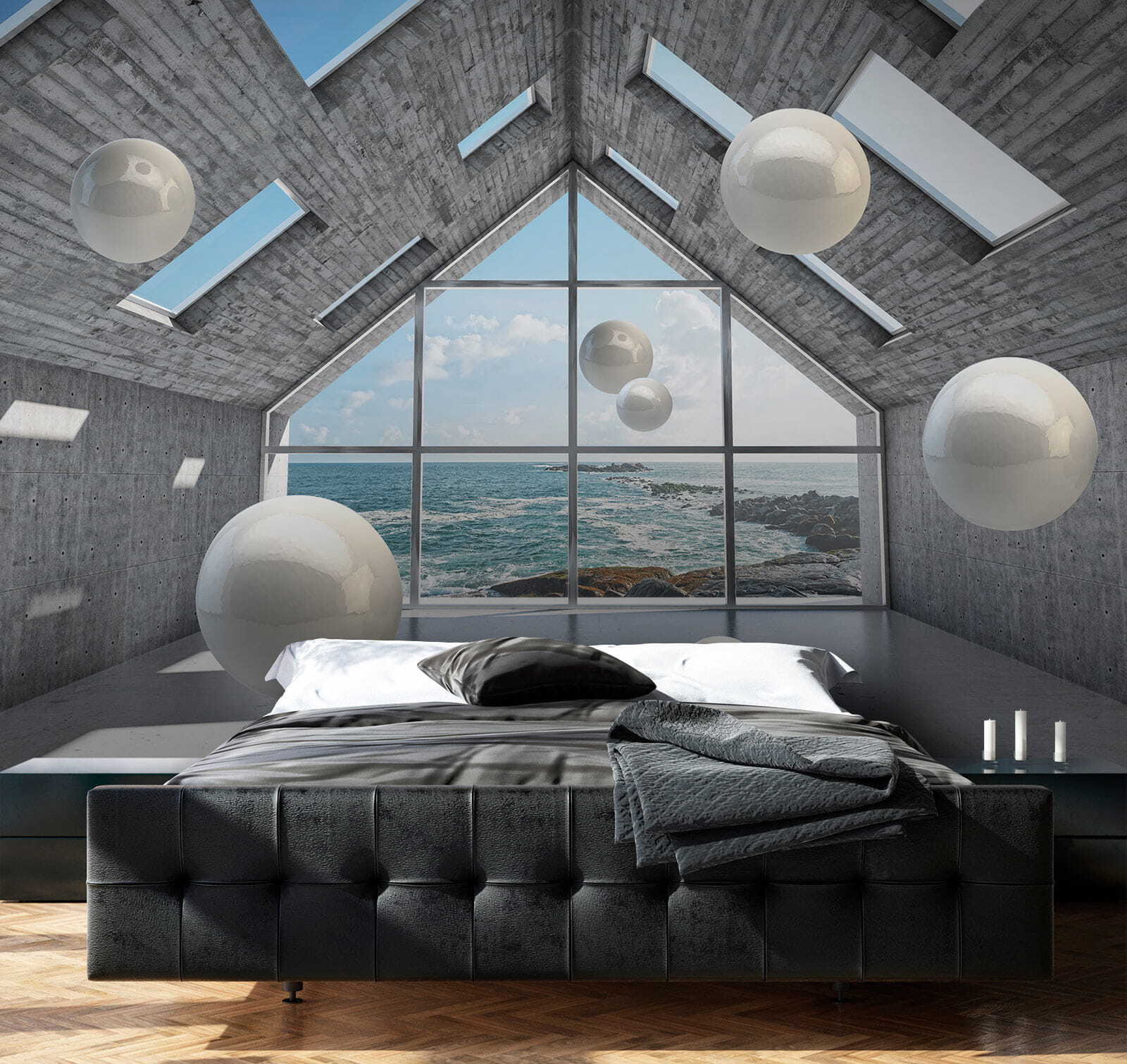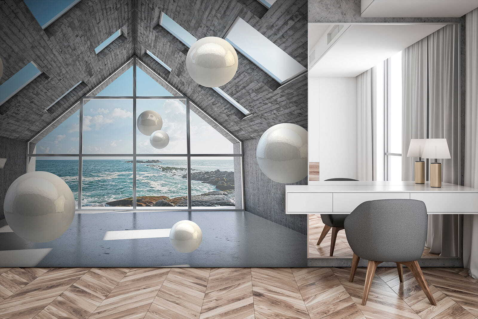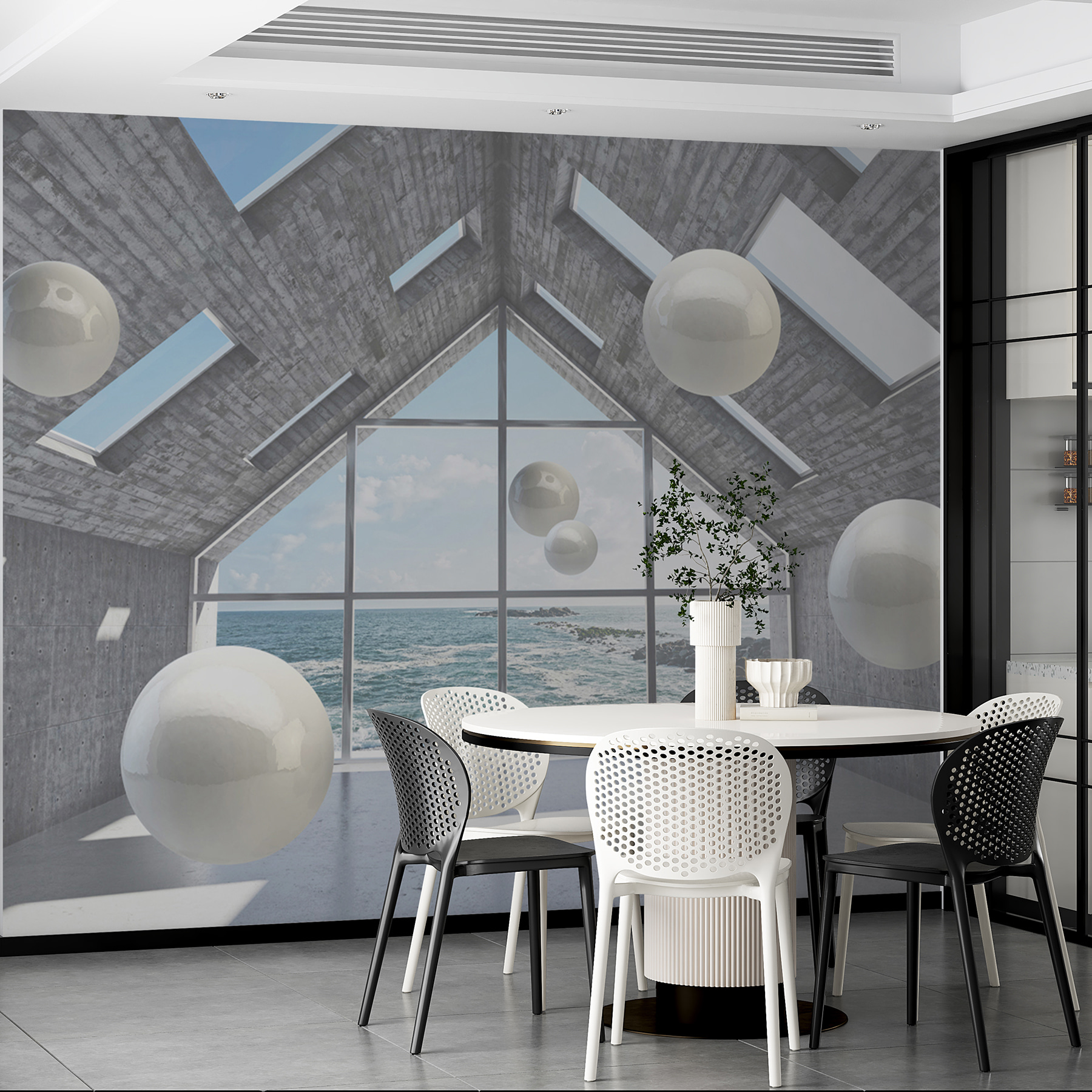 Premeňte svoj priestor na zasnený únik pomocou tejto nástennej maľby bielej gule vznášajúcej sa v betónovej miestnosti. Je to ako vstúpiť do umeleckej inštalácie bez toho, aby ste museli opustiť pohodlie domova. Predstavte si, ako popíjate kávu, stratení v myšlienkach, zatiaľ čo tieto elegantné gule akoby tancovali okolo vás. Spojenie moderného, industriálneho vzhľadu s tým hypnotizujúcim výhľadom na more vytvára mrazivú atmosféru. Je ideálna na podnietenie kreativity alebo len na chvíľu oddychu. Či už je to v útulnej obývačke alebo elegantnej kancelárii, táto nástenná maľba nabáda k zvedavosti a konverzácii, vďaka čomu každá stena ožije. Cíťte tú atmosféru!