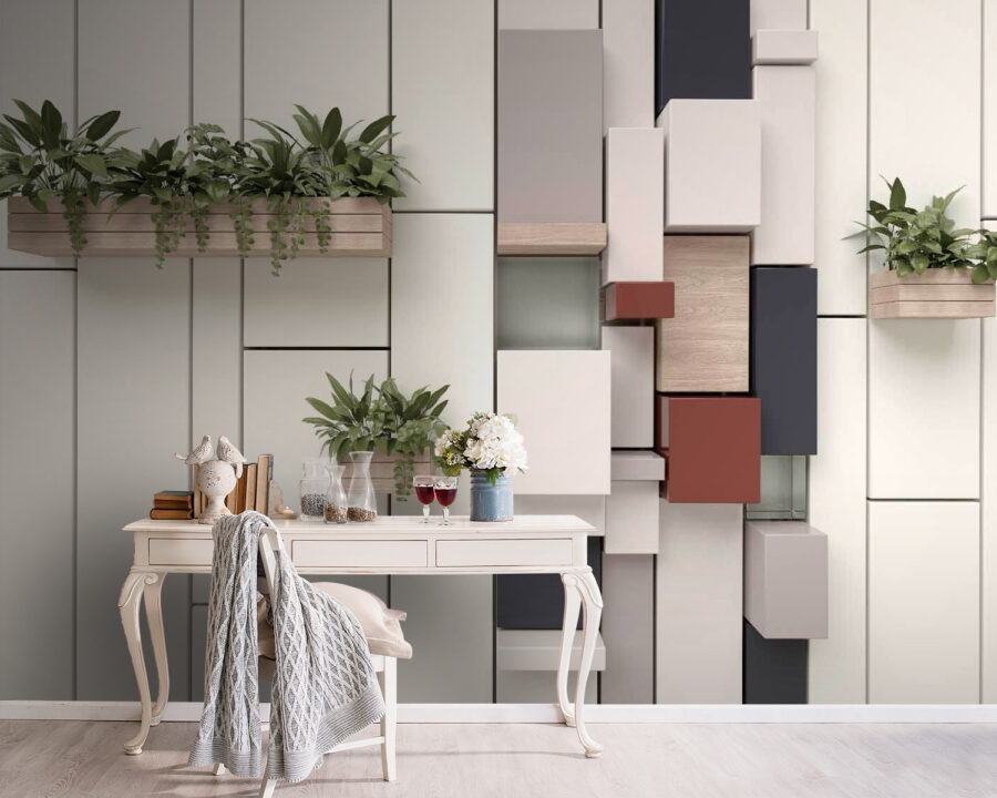 Premeňte svoj priestor s touto živou nástennou maľbou „Stena s rastlinami a krabicami“. Dokonale kombinuje moderné geometrické tvary so sviežou zeleňou a vytvára hravú, ale sofistikovanú atmosféru. Predstavte si túto tapetu vo vašej obývačke – každý pohľad na ňu je ako osviežujúci závan čerstvého vzduchu. Je to ako mať malú záhradku, ktorú nikdy nemusíte polievať. Navyše, jemné odtiene dodávajú vzdušný pocit a rozjasňujú každú nudnú stenu. Či už podnieti kreativitu v pondelok alebo len spríjemní prestávky na kávu, táto tapeta má čaro, ktoré pozdvihne váš interiér. Kto by povedal, že tapeta môže byť tak príjemná?