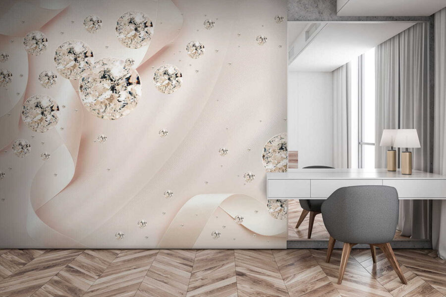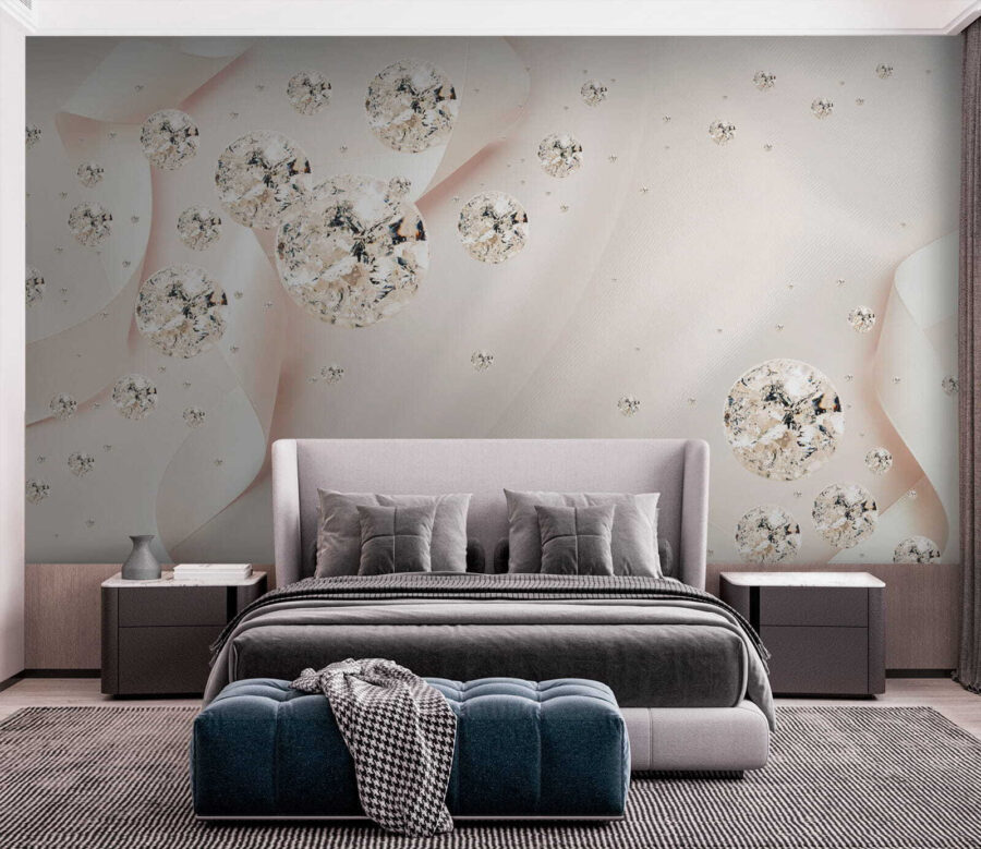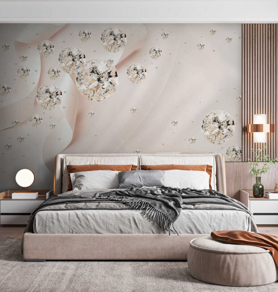 Pomocou tejto krásnej nástennej maľby premeníte nudnú stenu na živé plátno na rozprávanie príbehov. Predstavte si to: jemné stuhy víriace okolo fascinujúcich gúľ, vďaka ktorým sa každá miestnosť bude cítiť útulne a elegantne. Je to ako zasnený tanec jemných farieb a nežných tvarov, ideálny pre prípady, keď už tá obyčajná stena jednoducho nestačí. Či už ide o pokojnú spálňu alebo živý obývací priestor, táto nástenná maľba šepká šarm a pôvab ako hrejivé objatie pre vaše steny. Pozvite do svojho domova nádych kúzla, ktorý nechá hostí premýšľať, ako ste dokázali takéto kúzlo. Je to dekorácia s prímesou umeleckého vkusu!
