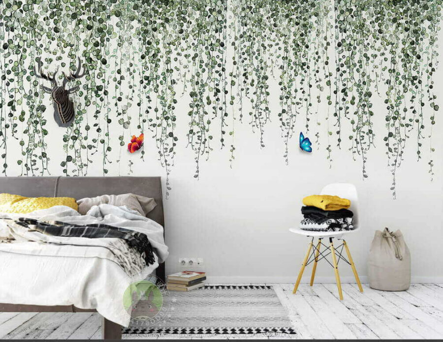 Predstavte si, že vstúpite do miestnosti obklopenej prírodou – táto tapeta tento sen premení na skutočnosť! S jemnými vínnymi révami padajúcimi kaskádami a farebnými motýľmi premení nudné steny na živý únik. Predstavte si, ako si oddýchnete s šálkou kávy, úplne ponorení do farieb a pokojnej atmosféry. Jemné zelené odtiene upokoja každý deň, zatiaľ čo hravé motýle tancujú vo svetle. Je to ako mať vo svojom priestore súkromnú záhradu! Táto tapeta je ideálna do útulného kútika alebo dokonca do živého detského izby a dodáva priestoru nádech fantázie, ktorý milujú všetci. Je vždy príjemné mať okolo seba trochu mágie, nemyslíte?