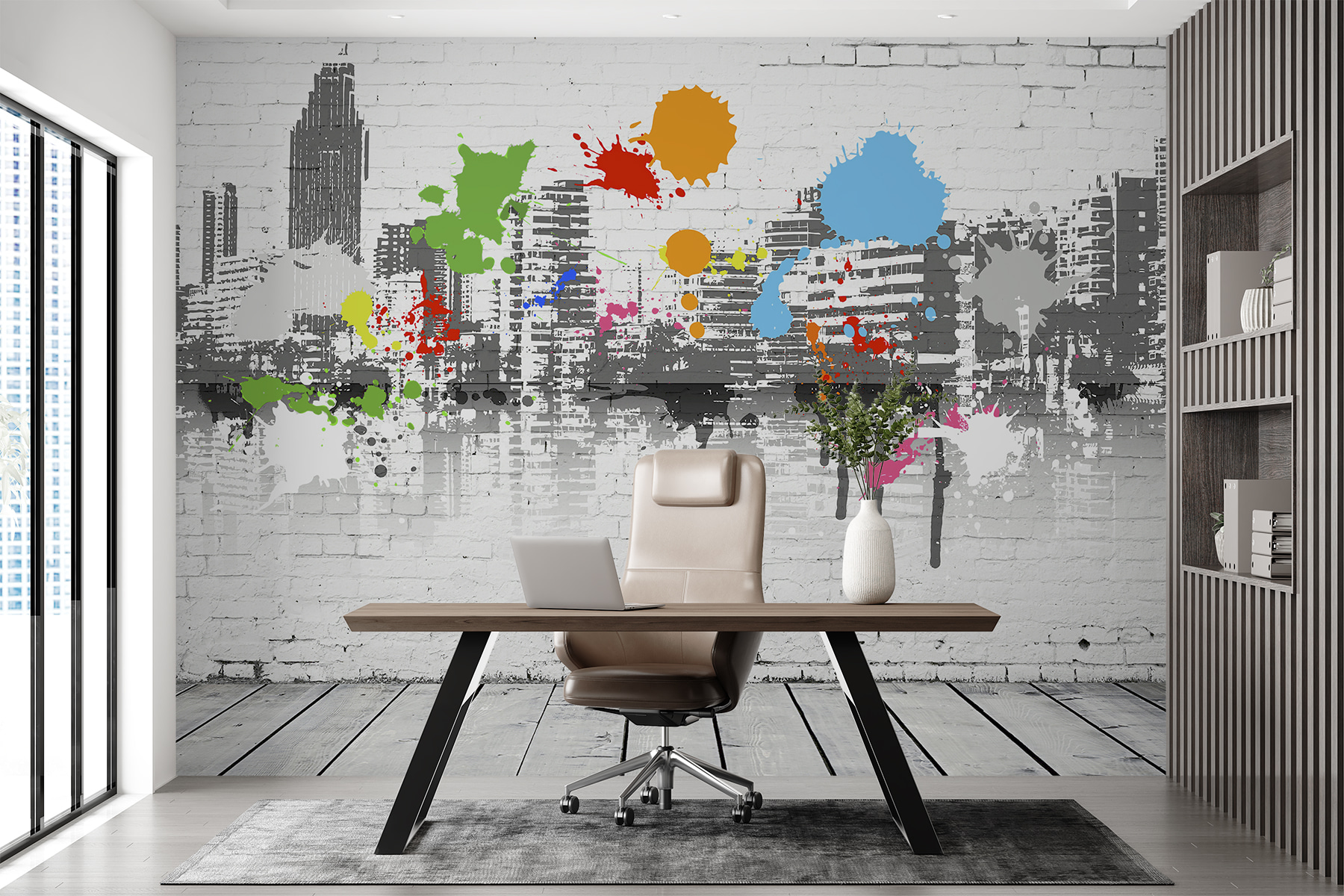 Táto nástenná maľba úplne zmení akýkoľvek priestor! Volá sa “Modrá škvrna na bielej tehlovej stene”, ale dokáže oveľa viac než len pridať farbu. Predstavte si, že by ste sa každý deň zobúdzali s týmto pohľadom – jasné, hravé striekance modrej, zelenej a ďalších žiarivých farieb na pozadí chladnej siluety mestskej krajiny. Je to ako dodať svojej izbe príval tvorivej energie bez akéhokoľvek neporiadku!