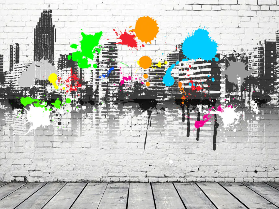 Táto nástenná maľba úplne zmení akýkoľvek priestor! Volá sa “Modrá škvrna na bielej tehlovej stene”, ale dokáže oveľa viac než len pridať farbu. Predstavte si, že by ste sa každý deň zobúdzali s týmto pohľadom – jasné, hravé striekance modrej, zelenej a ďalších žiarivých farieb na pozadí chladnej siluety mestskej krajiny. Je to ako dodať svojej izbe príval tvorivej energie bez akéhokoľvek neporiadku!