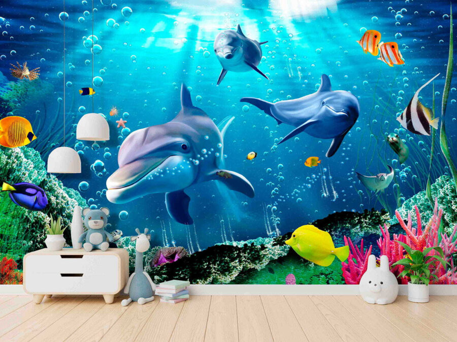 Predstavte si, že sa ponoríte do živého podmorského sveta bez toho, aby ste opustili svoju izbu – znie to úžasne, však? Táto nástenná maľba “Delfín plávajúci vo vode” je ako výbuch oceánskej mágie na vašich stenách. Delfíny, farebné ryby, koraly – je to ako malé dobrodružstvo priamo vo vašom obytnom priestore! Perfektne sa hodí do detských izieb alebo pre každého, kto je mladý srdcom, prináša spŕšku radosti a zázrakov. Vďaka 3D efektu máte pocit, že si takmer namočíte nohy… a úprimne, kto by nechcel plávať s delfínmi každý deň? Ponorte sa a nechajte svoju fantáziu plávať na plné obrátky!