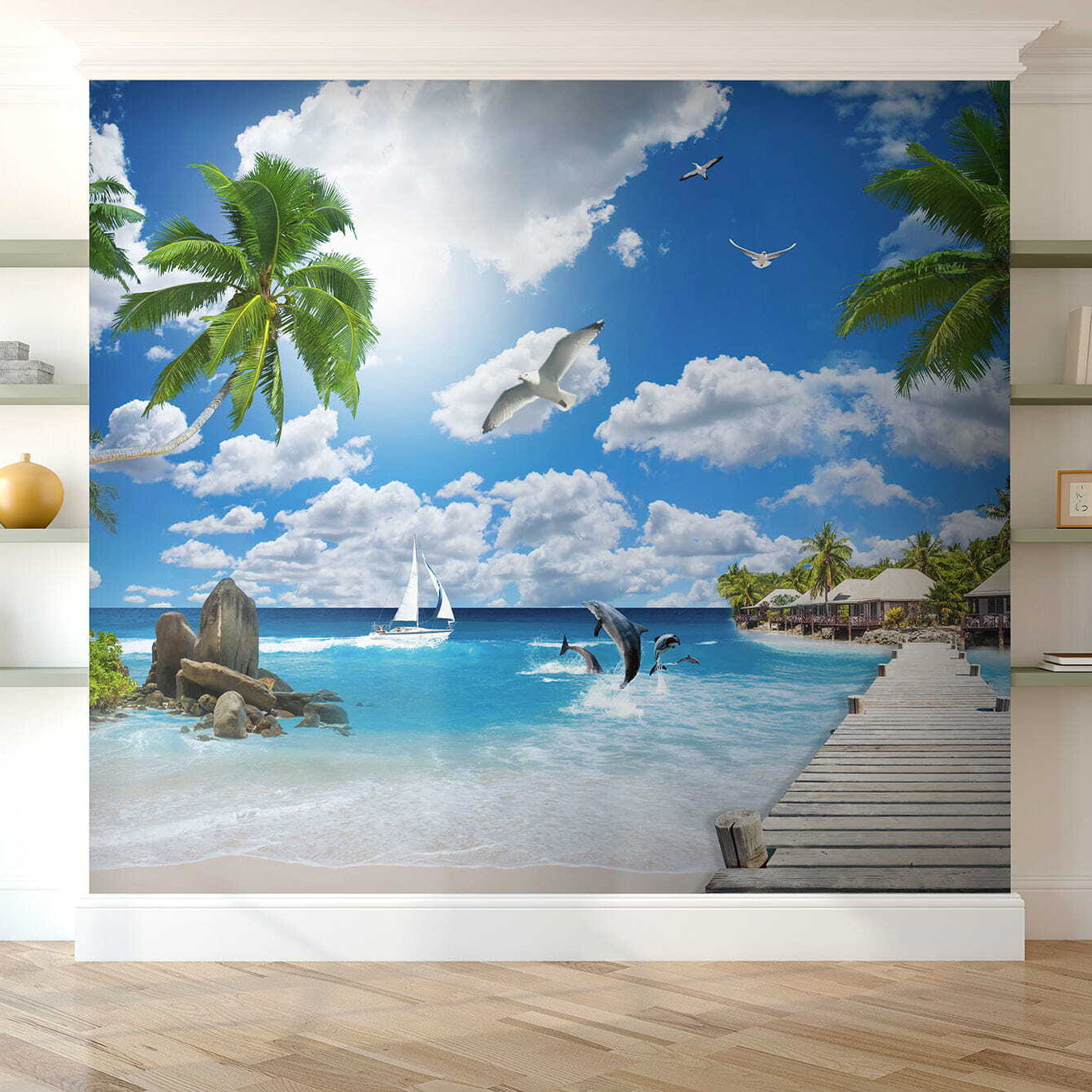 Predstavte si, že pri každom vstupe do miestnosti vstúpite do tropického raja. Táto úžasná nástenná maľba “Vták letiaci v oblakoch” vás rýchlo prenesie do dní zaliatych slnkom a jemného oceánskeho vánku. Žiarivá modrá a svieža zelená vás vtiahnu do seba ako chladivý nápoj v horúcom dni. Je ideálny na stenu, ktorá potrebuje trochu lásky, a vytvára pocit nekonečného leta. Predstavte si, ako sa zabávate s priateľmi alebo si len užívate pokojnú chvíľu – vdýchnite túto pokojnú atmosféru. Nie je to len dekorácia, je to pozvánka na únik z každodennosti a ponorenie sa do vlastného kúska zázraku prírody.