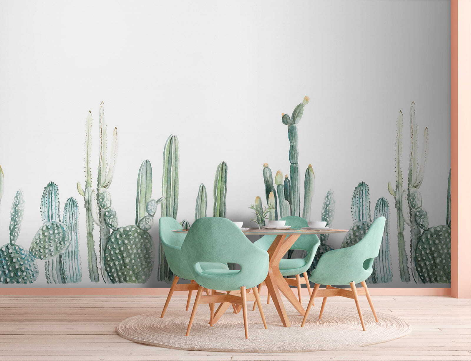 Premeňte akúkoľvek miestnosť na púštnu oázu pomocou tejto nádhernej nástennej maľby s akvarelovými kaktusmi v očarujúcich radoch. Predstavte si to: vojdete do svojho priestoru a zrazu je to ako prechádzka pokojnou záhradou, bez potreby opaľovacieho krému. Jemná zeleň a hravé tvary prinášajú pocit pokoja, takže je ideálna pre útulný čitateľský kútik alebo živú obývačku. Je to takmer ako mať domáci kaktus – bez náročnej starostlivosti. Táto nástenná maľba šepká teplo a pokoj a pozýva každého, kto vstúpi, aby si oddýchol a relaxoval. Tak smelo do toho, nechajte svoje steny dýchať životom!