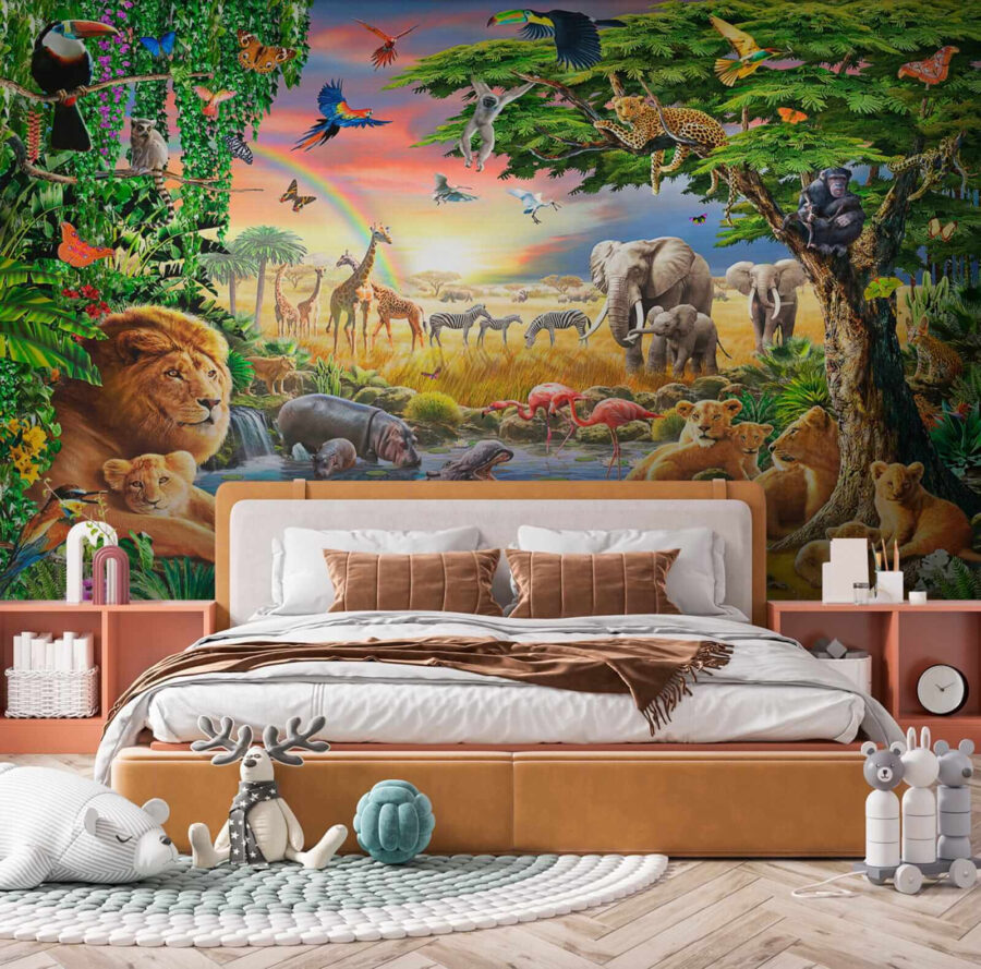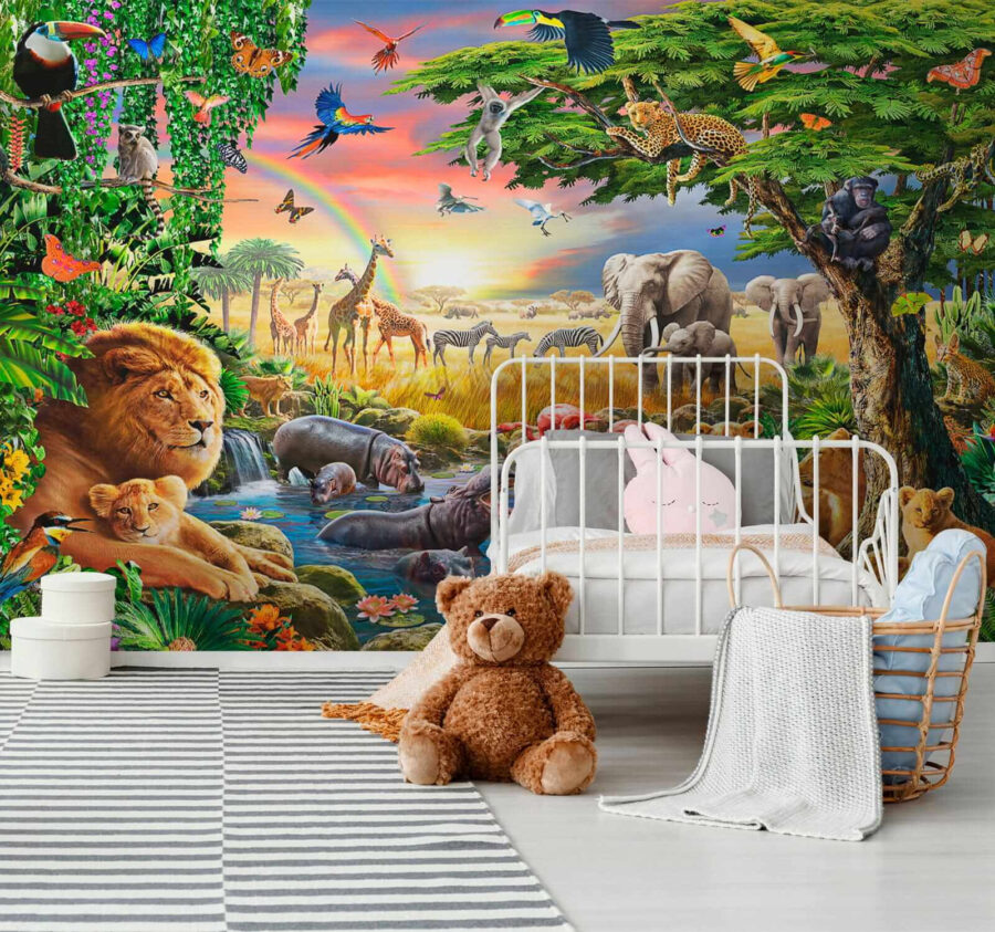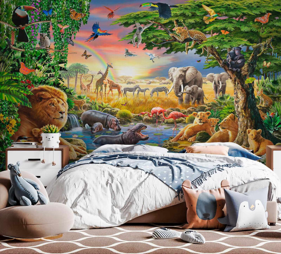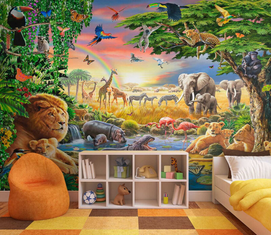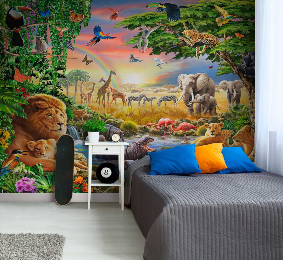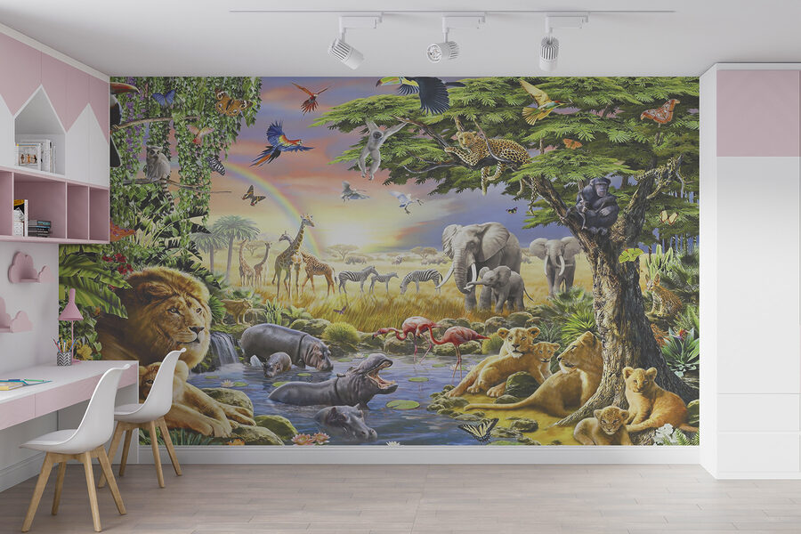 Predstavte si, že priamo vo svojej obývačke vstúpite do sviežej savany – presne o tom je táto nástenná maľba “Zvieratá savany sa zhromažďujú pri vode”. Je to ako mini africké safari s ležiacimi levmi, šantiacimi plameniakmi a slonmi, ktoré sa len tak poflakujú pri vode. Predstavte si to: prídete domov po dlhom dni, pozriete sa na túto živú nástennú maľbu a bum – okamžitá relaxačná atmosféra. Je to viac ako dekorácia, je to scéna plná života a farieb. Ideálna na pridanie kvapky dobrodružstva do každej miestnosti – stačí pohľad a možno budete takmer počuť vzdialené volanie divočiny. Navyše, nebolo by to skvelé na rozprúdenie konverzácie s priateľmi? Rozhodne sa na ňom dá vyniknúť!