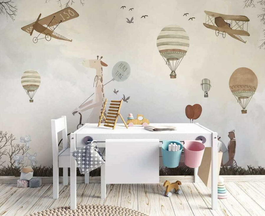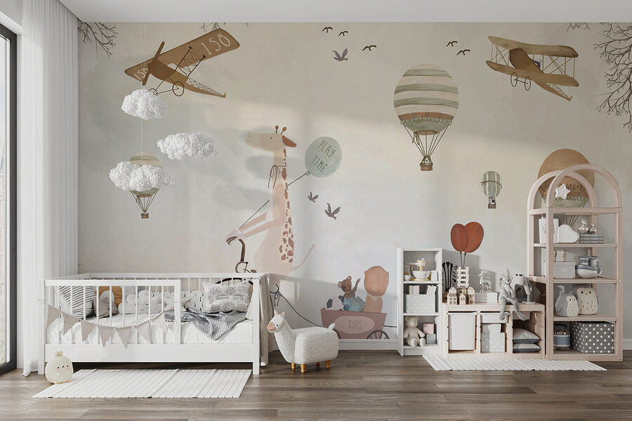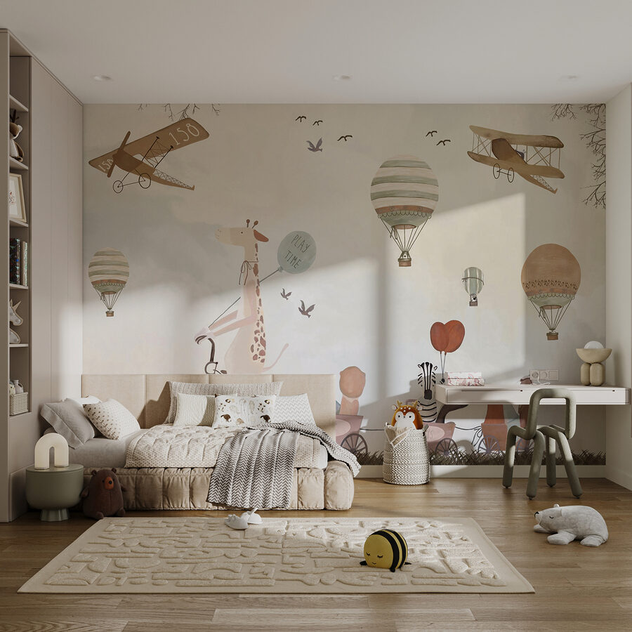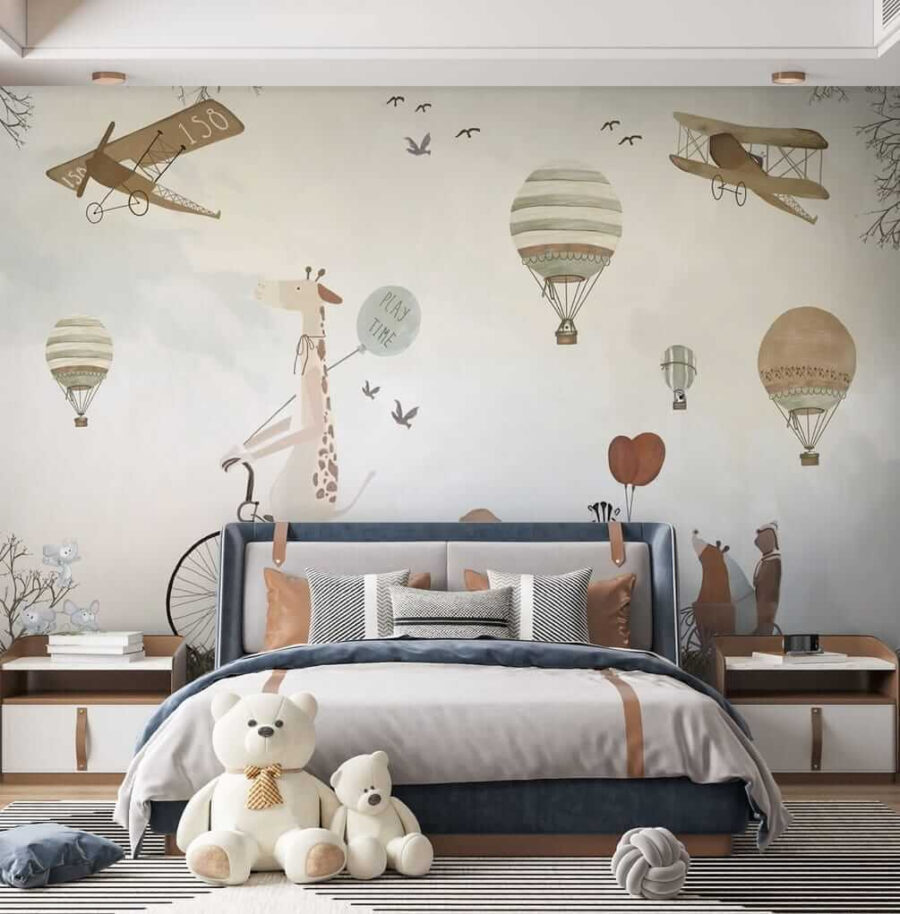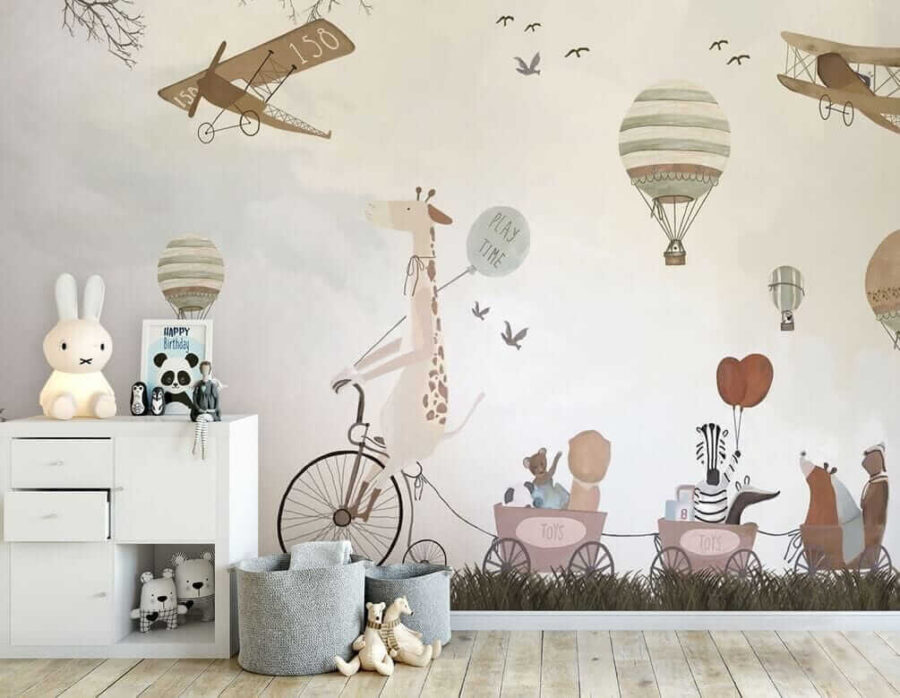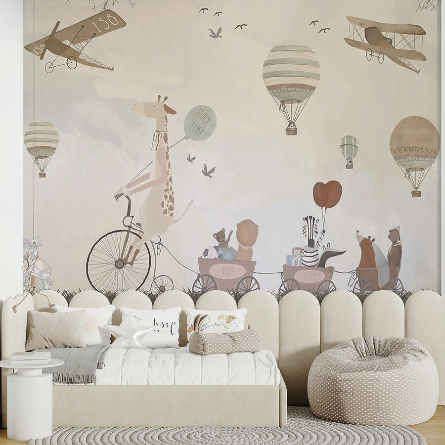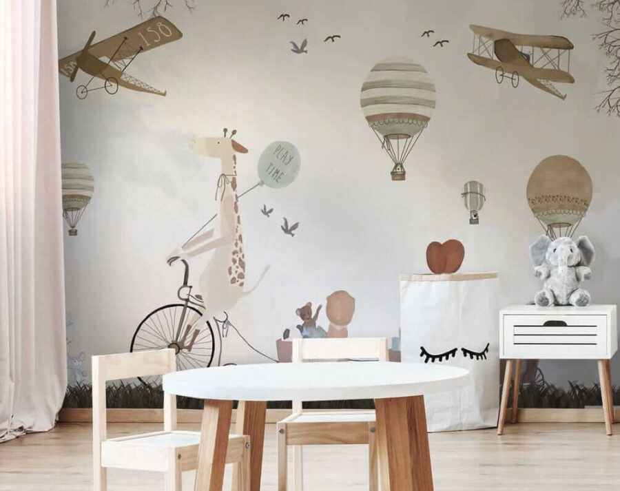 Premeňte detskú izbu na rozmarné dobrodružstvo s touto očarujúcou nástennou maľbou teplovzdušného balóna! Predstavte si chichotajúcu sa žirafu na bicykli, ktorá sa delí o “hravé” vibrácie s rozkošnými zvieracími priateľmi – je to ako oživená rozprávková kniha.