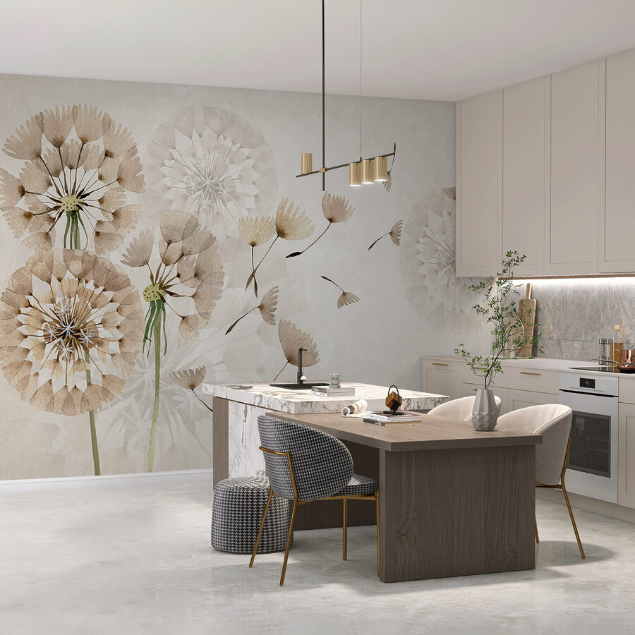 Predstavte si, že vojdete do miestnosti a okamžite pocítite závan pokoja… Presne to dokáže táto nástenná maľba. “Jemné púpavy unášané vánkom” zachytáva tie chvíle, keď sa zdá, že čas jednoducho odpláva. Táto nástenná maľba je ideálna do detskej izby alebo útočiska tínedžerov a dodá každému priestoru nádych rozmarnosti a zázraku. A tie zemité tóny? Sú ako vizuálne objatie, hrejivé a prívetivé. Tak dobre zapadne do interiéru, či už ide o detský kútik alebo oddychovú zónu mladého človeka. Pri každom pohľade takmer cítite jemný šepot prírody… ako denný sen namaľovaný na stene!