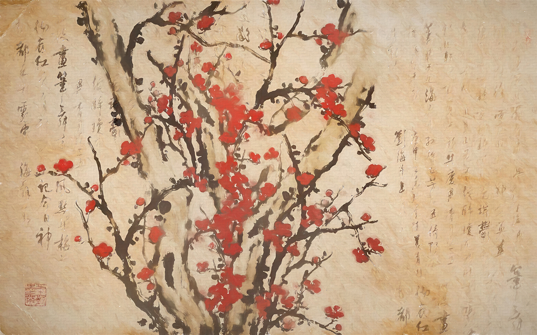 Fototapety Maľba stromu s červenými kvetmi Fototapety Maľba stromu s červenými kvetmi