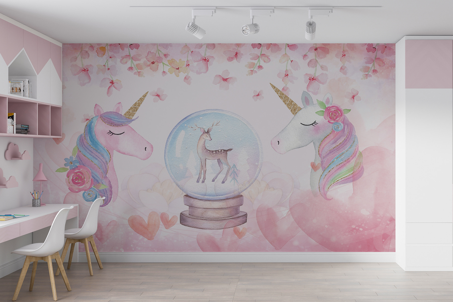 Táto nástenná maľba s nežnými jednorožcami uprostred jemných ružových kvetinových odtieňov a úžasným jeleňom v snehovej guli je ako z rozprávky. Jemné akvarelové odtiene pôsobia upokojujúco, zatiaľ čo hravé detaily podnecujú predstavivosť a rozmar.