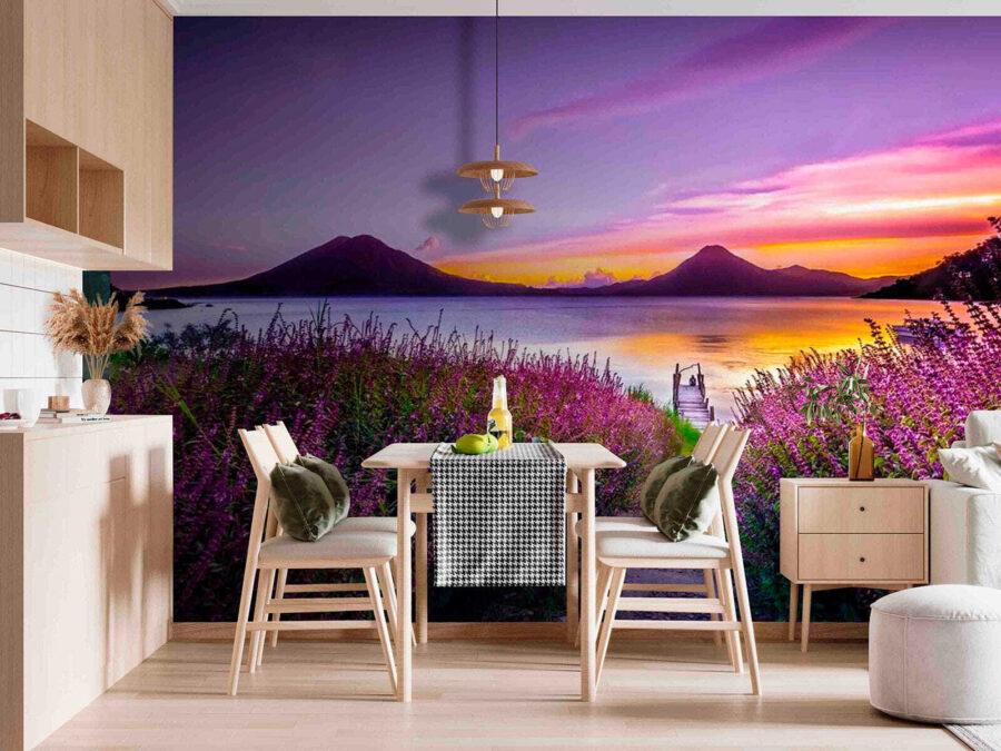 Predstavte si, že zakaždým, keď sa pozriete na svoju stenu, vstúpite do pokojného úniku. Táto nástenná maľba s pokojnou cestičkou vedúcou k trblietavému jazeru orámovanému žiarivými fialovými kvetmi vás vtiahne priamo do náručia prírody. Upokojujúce fialové a modré farby vytvárajú pokojnú atmosféru, ktorá je ideálna pre útulný čitateľský kútik alebo príjemný vstupný priestor. Keď slnko klesá pod obzor, tieto jemné odtiene nabádajú k pocitu pokoja. Je to ako minidovolenka priamo u vás doma, kde každý pohľad môže spôsobiť, že svet vonku bude o niečo pokojnejší a jasnejší. Ideálne na snívanie alebo jednoducho na relaxáciu.