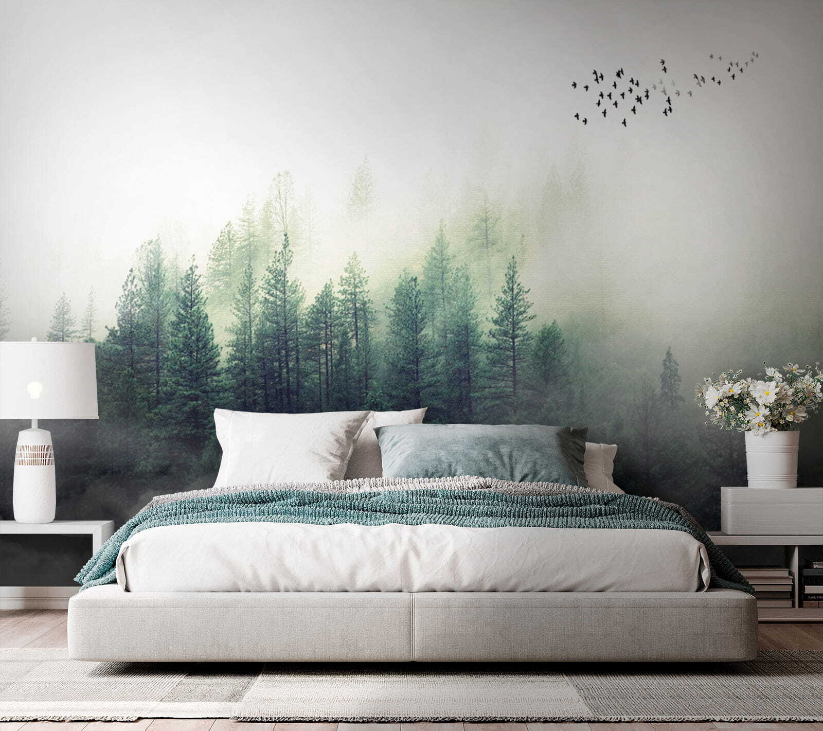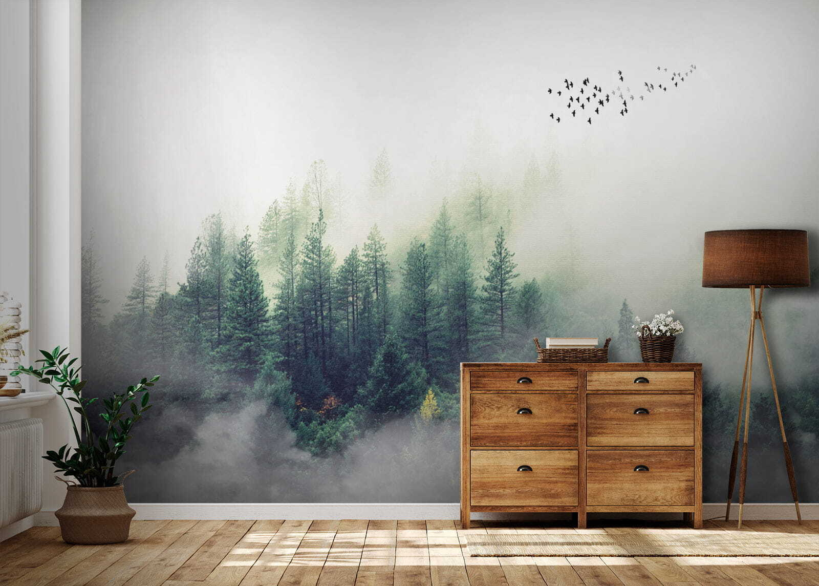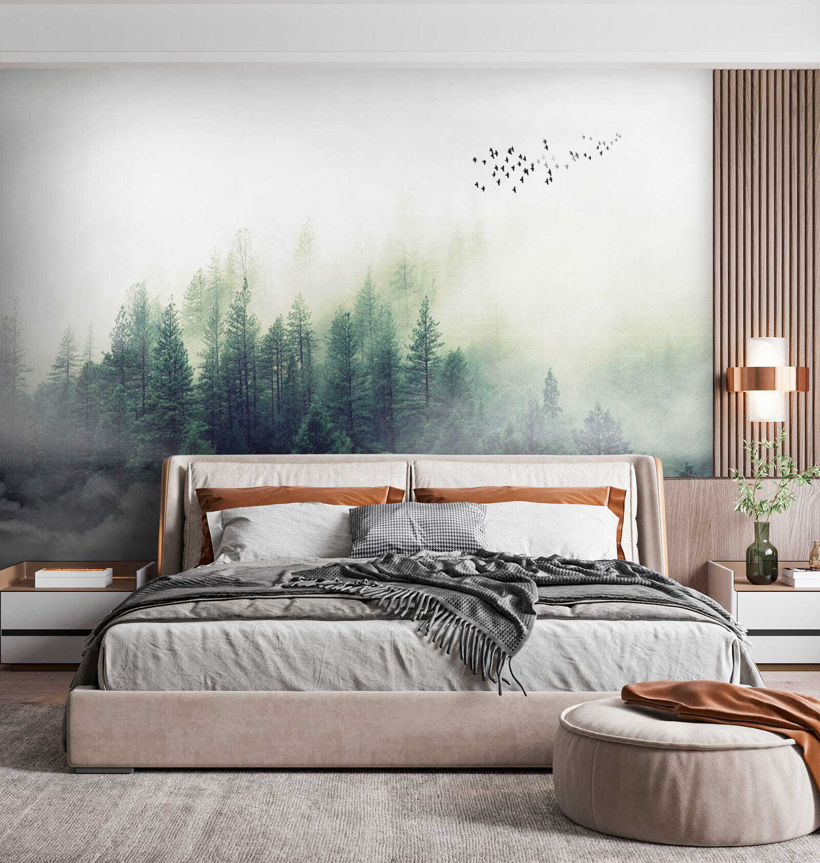 Predstavte si, že sa každé ráno pozeráte na hmlistý les – ach, ten pokoj! Táto fototapeta “Rozmazaný obraz tváre človeka” akoby vniesla útulnú atmosféru chaty priamo do vašej obývačky. Les pôsobí tak čarovne, takmer akoby ste mohli vojsť priamo do pokojnej zelene a stratiť sa v prírode. Vtáky poletujúce v diaľke navyše dodávajú nádych rozmarnosti.