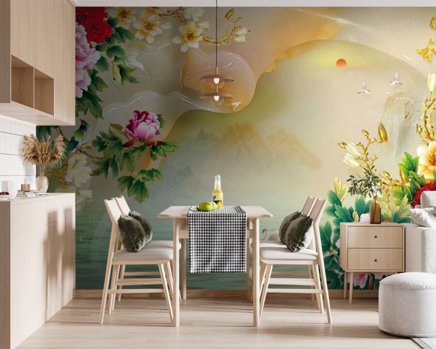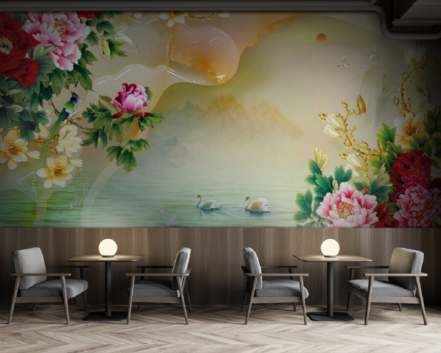 Premeňte akýkoľvek priestor na pokojnú oázu s touto očarujúcou nástennou maľbou s živými kvetmi a ladnými labutami. Kvitnúce pivonky žiaria farbami a vytvárajú živú atmosféru, zatiaľ čo pokojné labute sa vznášajú nad rozprávkovou vodnou hladinou a lákajú k relaxačnému popoludňajšiemu pohľadu. Predstavte si, ako tu popíjate čaj a máte pocit, že ste vstúpili do akvarelovej maľby. Tento kúsok je ideálny na akcentové steny alebo útulné kútiky, kde sa bez námahy spája krása prírody s vaším interiérom. Nie je to len umenie, je to pozvánka na zastavenie sa, nadýchnutie sa a trochu väčšie vychutnanie si života.