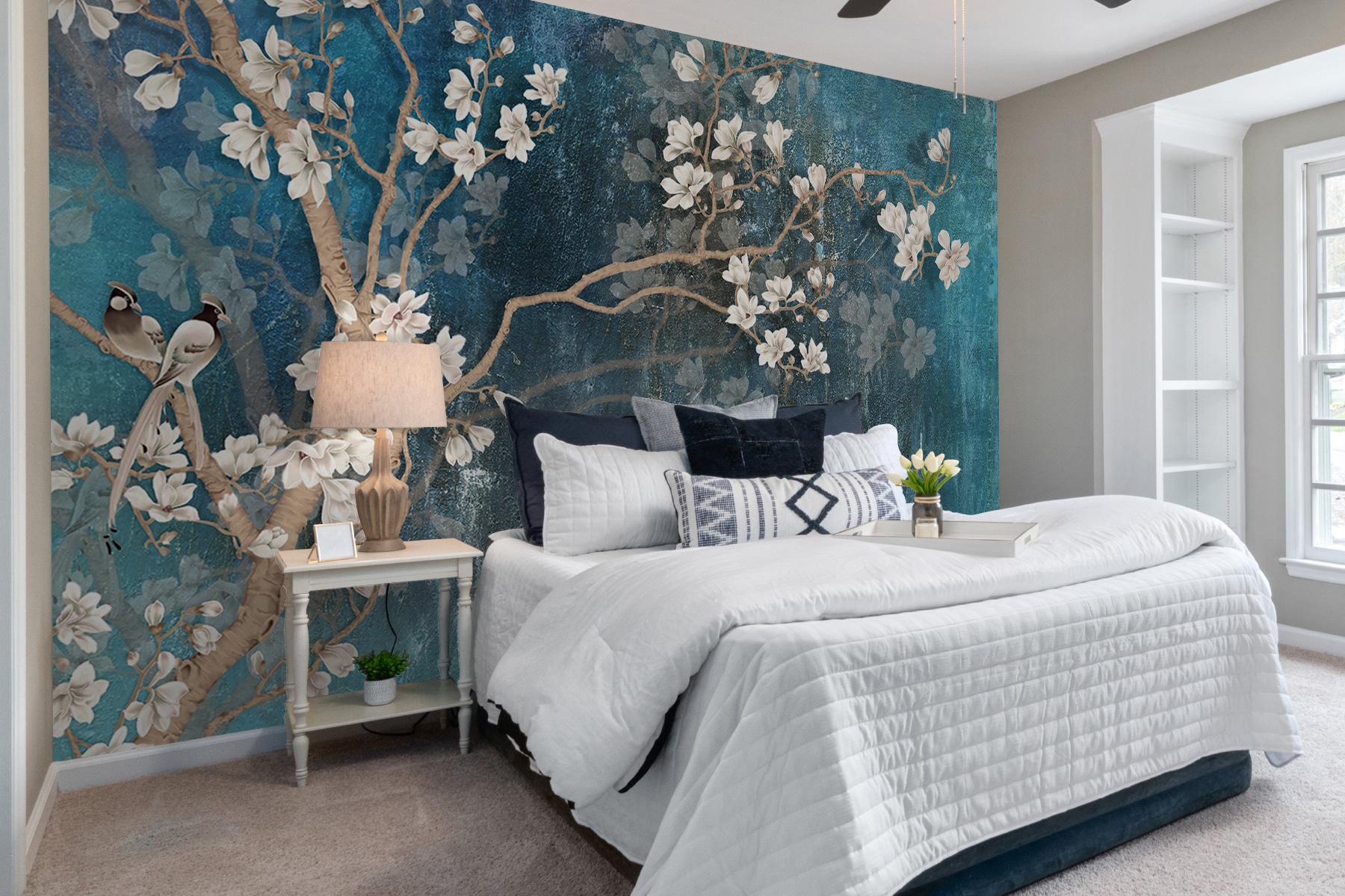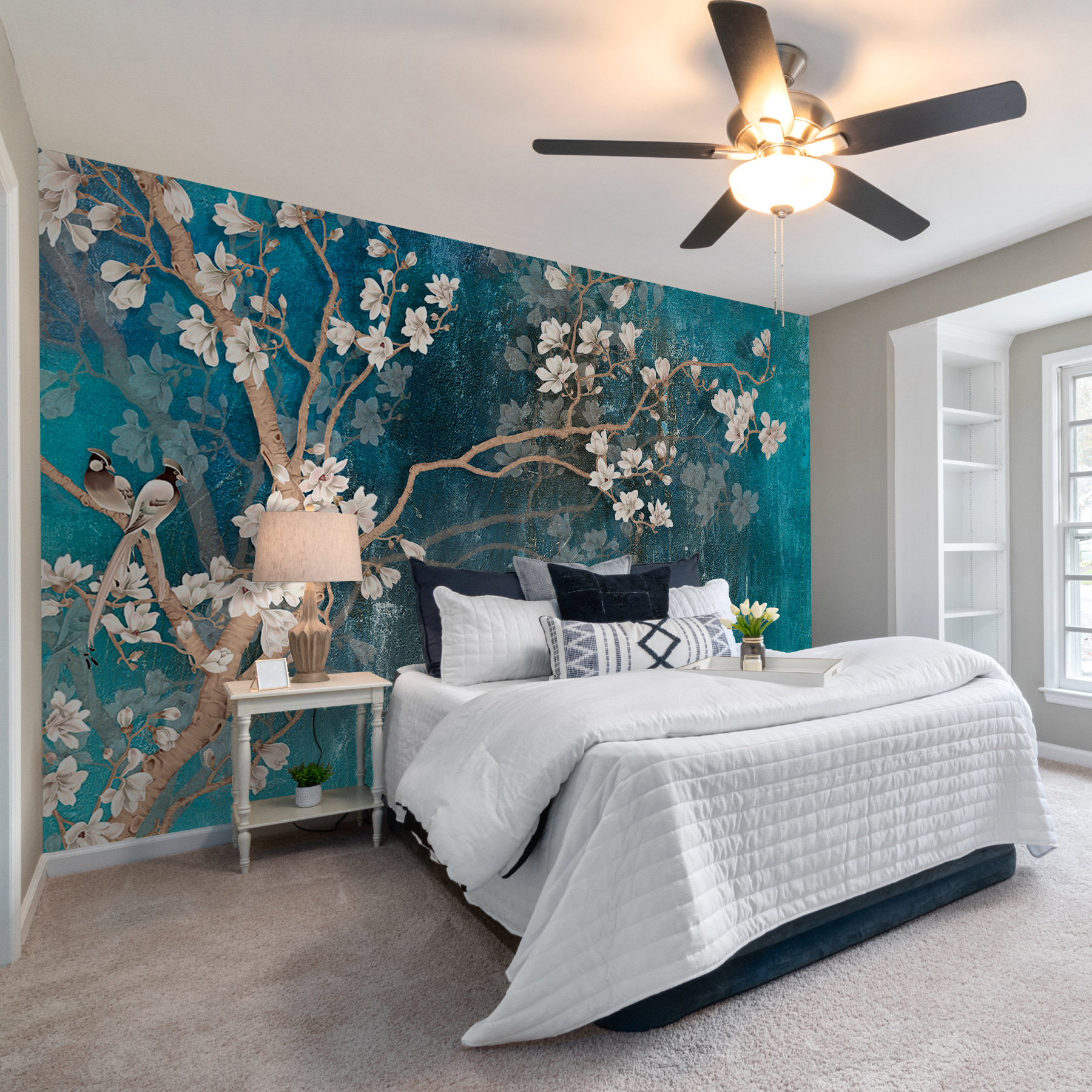 Snívali ste niekedy o tom, že si do interiéru prinesiete nádych krásy prírody? Táto fototapeta “Biely kvet na modrom pozadí” je ako závan čerstvého vzduchu pre váš priestor! Predstavte si jemné biele kvety kaskádovito rozprestierajúce sa na zasnenom modrom pozadí s pôvabnými vtáčikmi, ktorí na ňom tak pôvabne sedia. Je to ako mať vlastnú tajnú záhradu bez zalievania!
