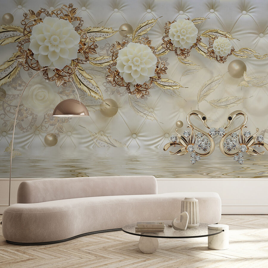 Fototapety Elegantné labute uprostred kvetinovej výzdoby Fototapety Elegantné labute uprostred kvetinovej výzdoby
