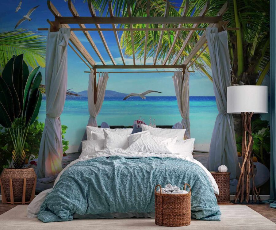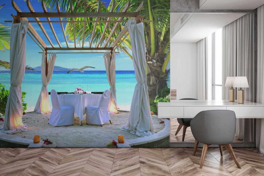 Predstavte si, že vstúpite do raja bez toho, aby ste opustili svoj domov. Táto živá nástenná maľba „Wall Murals Table Set Up on a Beach“ vás pozýva, aby ste si oddýchli vo svojej obývačke a snívali o piesku medzi prstami a morským vánkom. Predstavte si romantickú večeru pod kyvajúcimi palmami a zvukom jemných vĺn v pozadí. Je to ako mini dovolenka zakaždým, keď sa na ňu pozriete! Svojimi živými farbami a tropickou atmosférou táto tapeta vdychuje život do každého priestoru. Je ideálna pre snílkov a milovníkov pláže, ponúka dokonalú rovnováhu medzi relaxom a dobrodružstvom. Prineste si trochu plážovej mágie do interiéru – kto by to nechcel?
