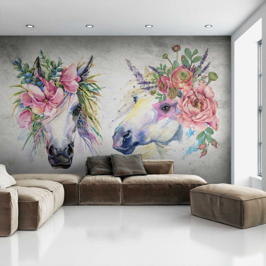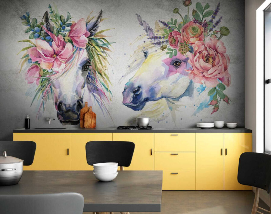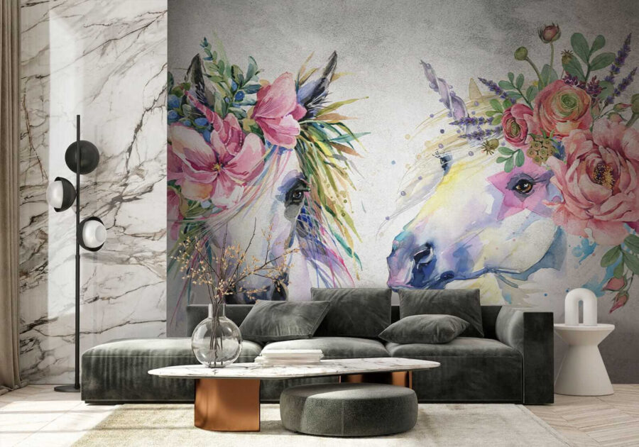 Predstavte si, že vojdete do miestnosti a privítajú vás tieto úžasné kone ozdobené kvetinovými korunami! Táto živá nástenná maľba vnesie do každého priestoru príval farieb a rozmarov – ideálna do detskej izby, detskej izby alebo dokonca do kreatívneho štúdia. Akvarel pôsobí priam snovo, takmer akoby ste vstúpili do rozprávkovej záhrady. Jemné kvety a výrazné oči koní dodávajú nádych kúzla a pokoja, ktorému je ťažké odolať.