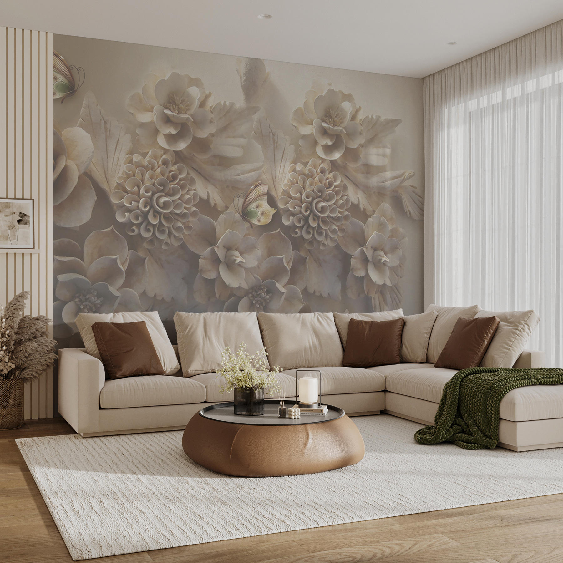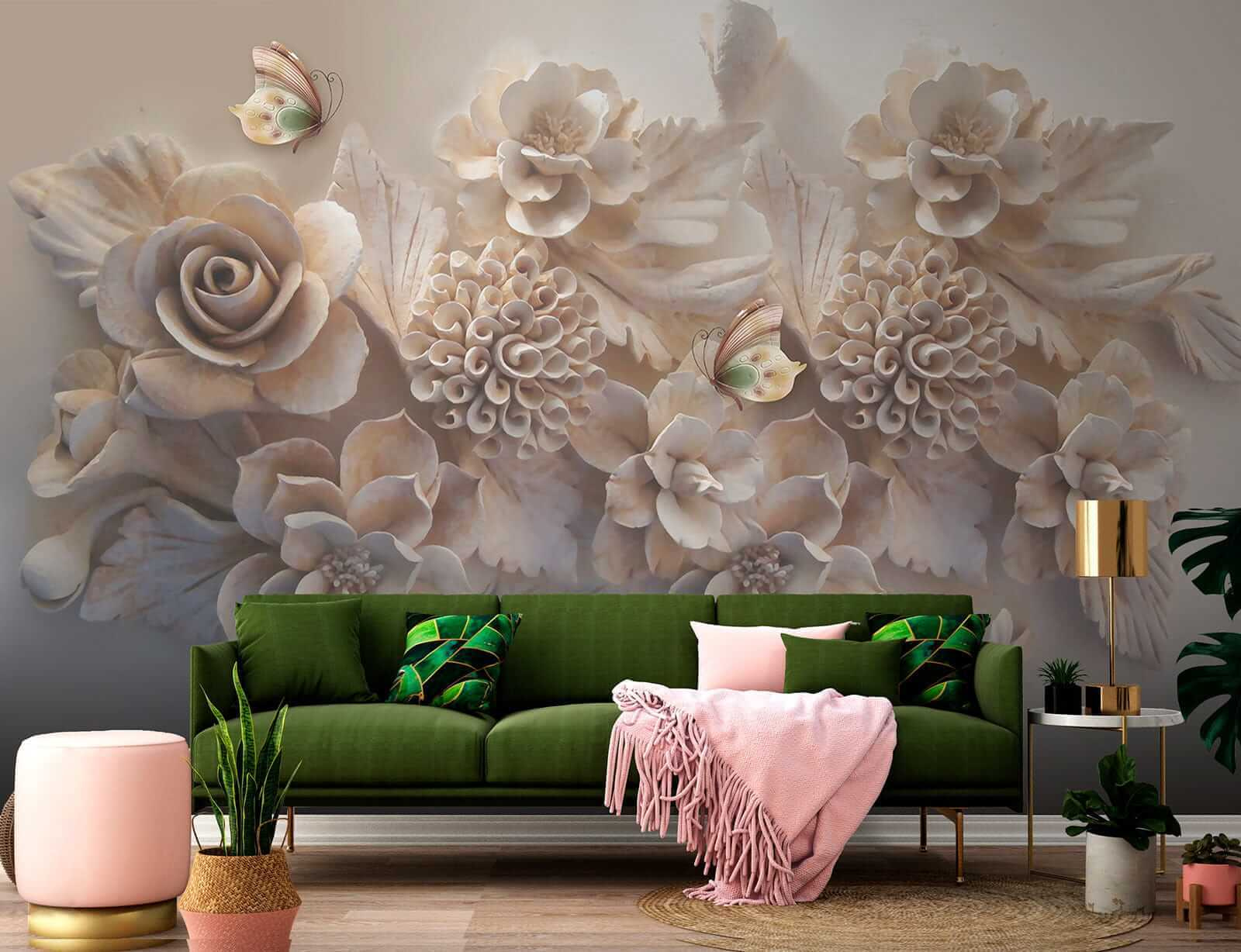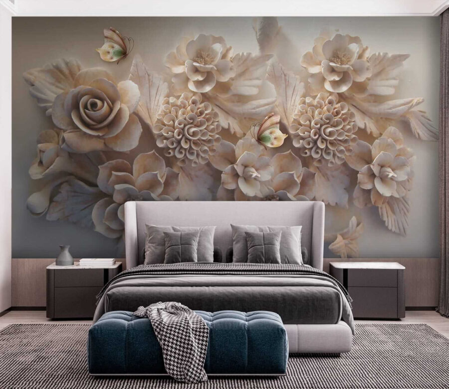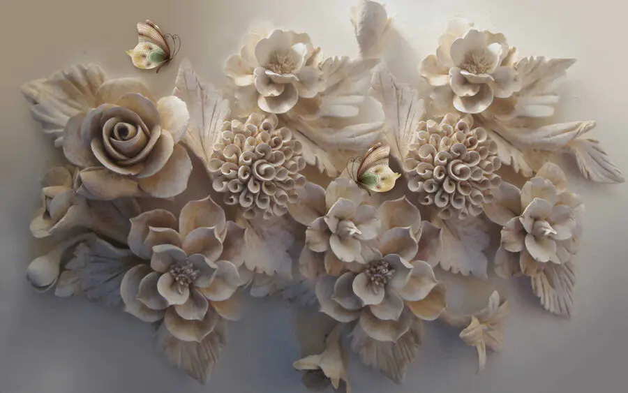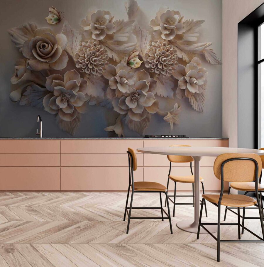 Premeňte svoj priestor s týmto majstrovským dielom “Nástenné maľby Elegantné kvety s pôvabnými motýľmi”! Je to viac ako len nástenná maľba – je to akoby ste do interiéru preniesli pokojnú záhradu. Predstavte si, že sa každé ráno budíte na tieto realistické kvety a rozmarné motýle… Hovorte o tom, ako začať deň na dobrú nôtu! Zložité 3D detaily ruží a kvetov dodávajú vašim stenám hĺbku a textúru, vďaka čomu sa budú cítiť ako živé.