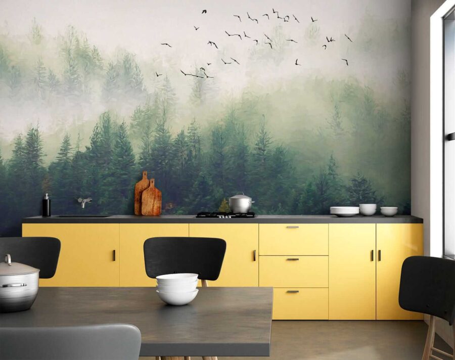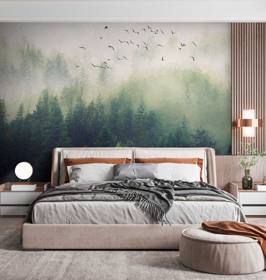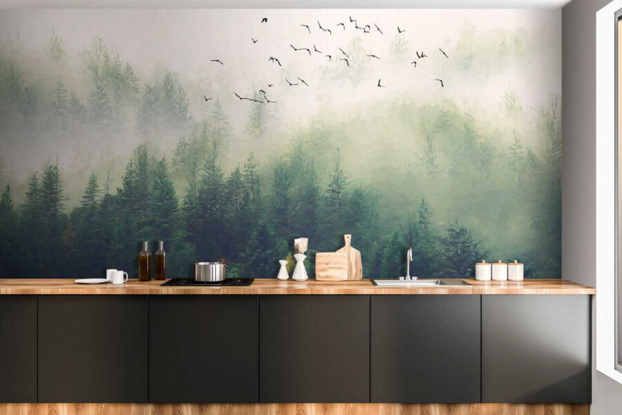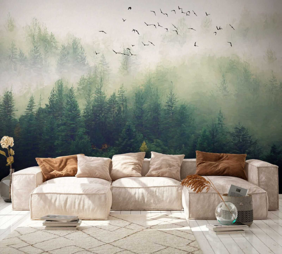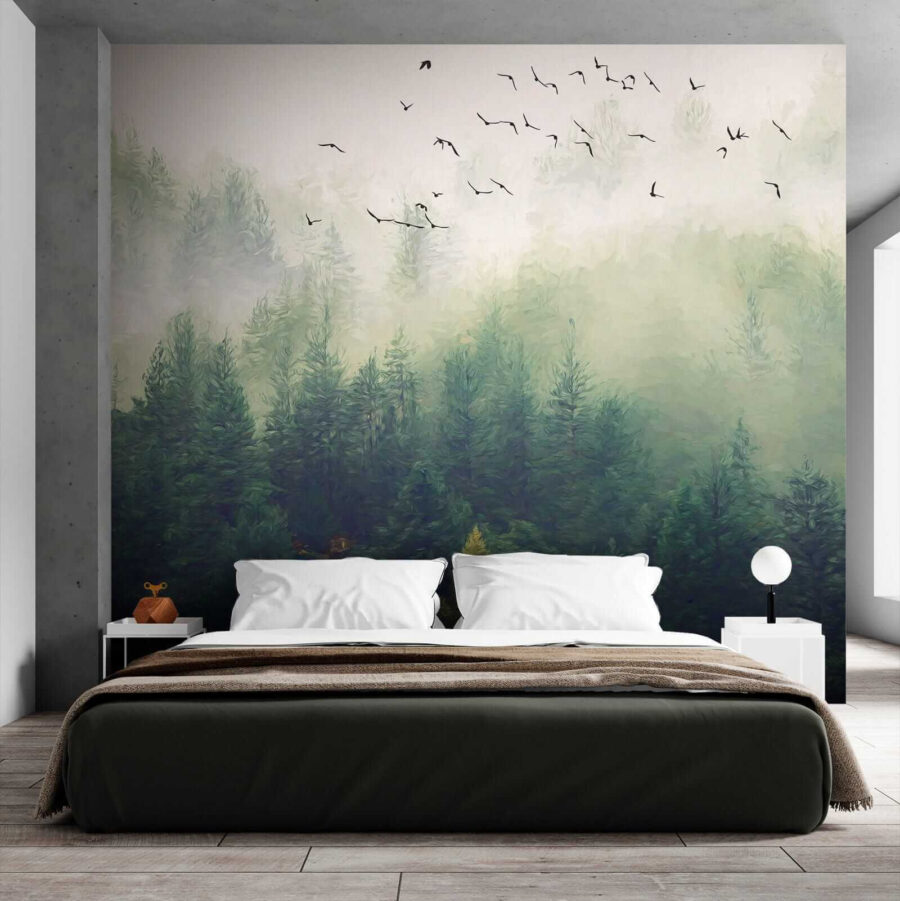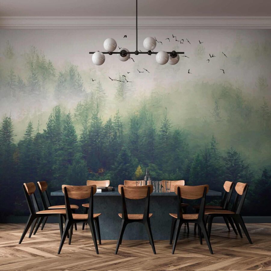 Premeňte svoj priestor s touto úžasnou nástennou maľbou, na ktorej sú zobrazené vtáky lietajúce nad hmlistým lesom. Predstavte si, že vstúpite do pokojného útočiska priamo vo vašej obývačke! Jemné zelené farby a mäkká hmla vás obklopujú ako útulná deka, zatiaľ čo vtáky vás akoby pozývajú, aby ste sa pridali k ich ceste. Je to, ako keby sa príroda rozhodla sama vyzdobiť váš domov!