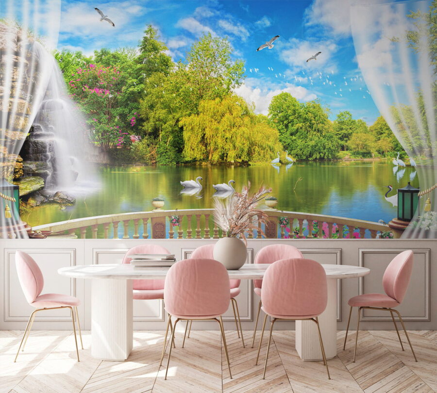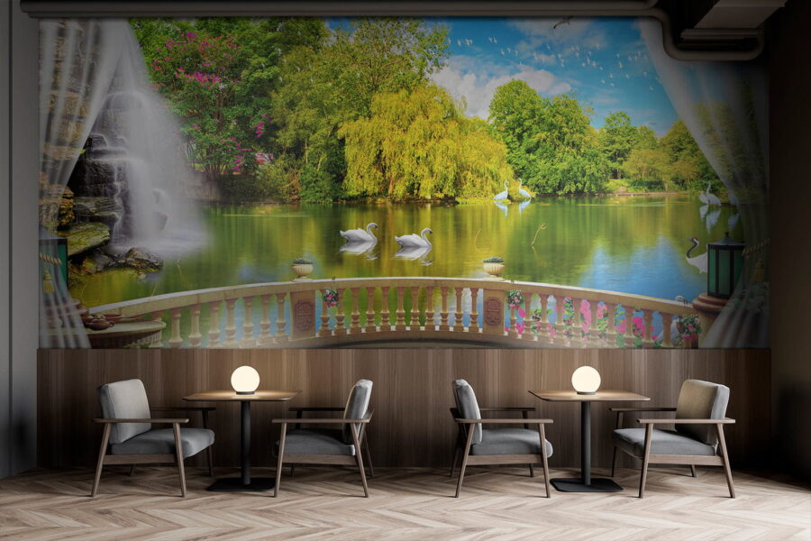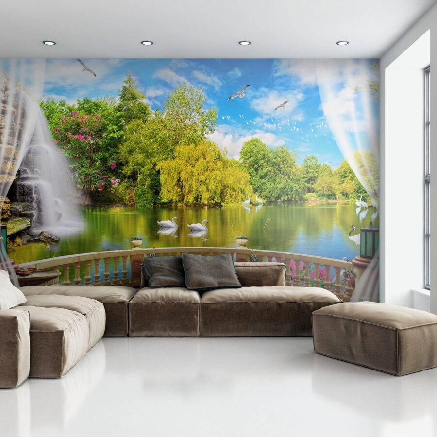 Premeňte akúkoľvek miestnosť na pokojnú oázu s touto očarujúcou nástennou maľbou „Pohľad na rybník s vtákmi a stromami“. Predstavte si, že popíjate rannú kávu a zrazu chaos sveta zmizne – ste len vy, pokojná voda a ladné labute, ktoré sa kĺžu po hladine. Živé zelené a modré farby prinášajú prírodu priamo na vaše steny, vďaka čomu sa každý deň budete cítiť ako na pokojnej prechádzke pri vode. Táto tapeta je ideálna do útulného kútika alebo živého obývacej izby a nie je len dekoráciou; je to malý kúsok pokoja, ktorý vám šepká: „Nadýchnite sa, zaslúžite si to.“ Nie je čas prijať túto upokojujúcu atmosféru?