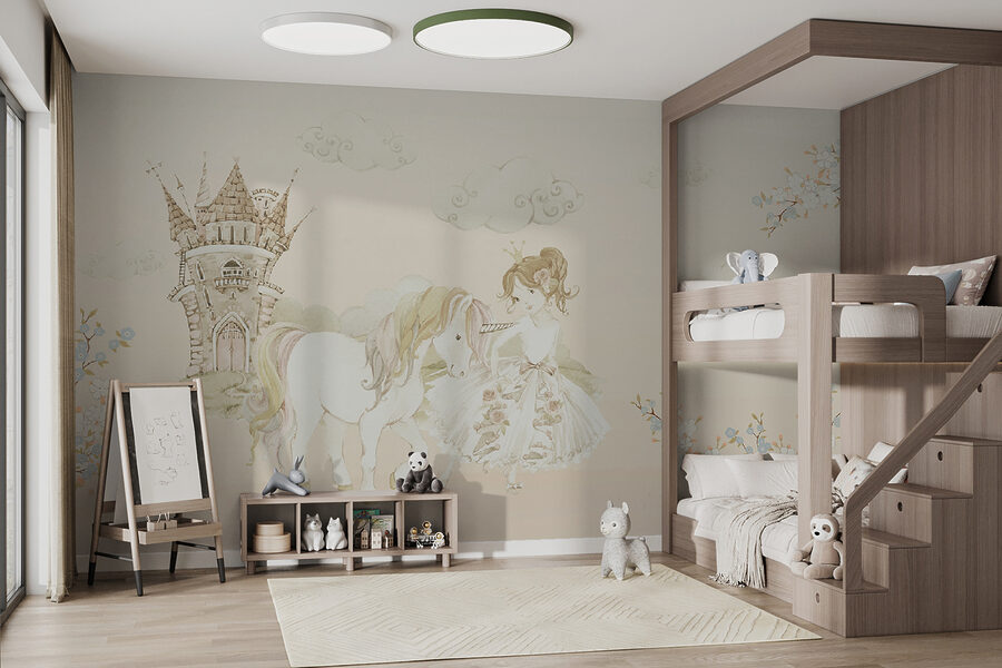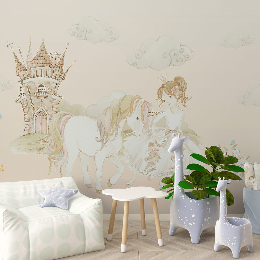 Predstavte si stenu, ktorá vás prenesie priamo do rozmarnej rozprávky – hrad v diaľke, princezná so svojím verným jednorožcom po boku. Táto nástenná maľba je ako vstúpiť do snového príbehu zakaždým, keď vstúpite do miestnosti. Jemné pastelové farby a delikátne detaily sú jednoducho… čarovné. Ideálna do detskej izby alebo pre každého, kto má rád vo svojom živote trochu kúziel. Navyše tie nadýchané obláčiky a sladké kvety? Vďaka nim sa každý deň bude cítiť ako slnečný deň v rozprávkovej krajine. Hovorte o kúsku, ktorý podnecuje predstavivosť a okamžitý úsmev!