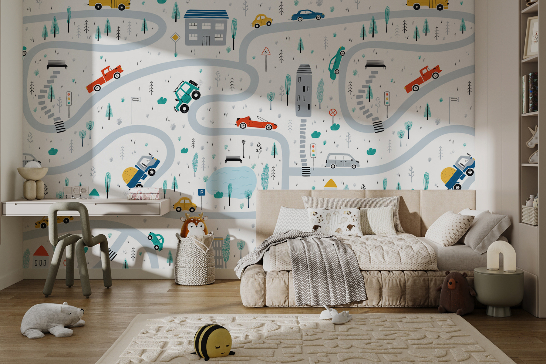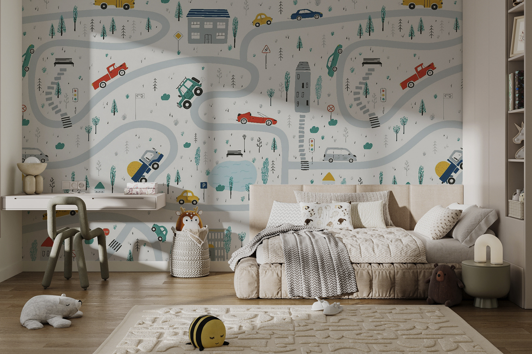 Máte dieťa, ktoré miluje autá a budovy? Táto “Nástenná mapa áut a budov” je úplný sen! Predstavte si – živé cesty vinúce sa po celej stene, farebné autá, ktoré sa preháňajú, a očarujúce malé budovy, ktoré sú na scéne. Je to ako žiť v mini mestskej krajine! Táto nástenná maľba rozžiari každú detskú izbu a premení obyčajné steny na hravé dobrodružstvá. Perfektne sa hodí na rozprávanie príbehov alebo podnecovanie fantázie dieťatka – len si predstavte, aké príbehy sa budú odohrávať pred spaním! Jemné farby a rozmarné kresby navyše zútulnia priestor a dodajú mu pocit zábavy. Nie je to len nástenná maľba, je to pozvánka na objavovanie, snívanie a každodennú hru.