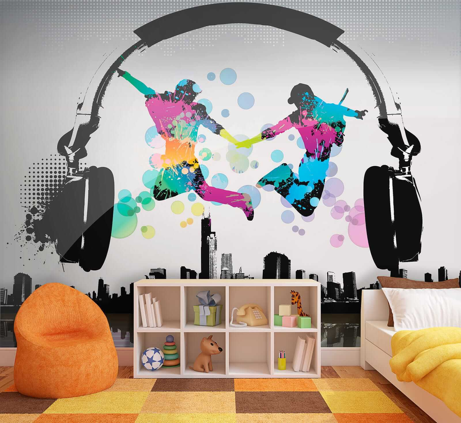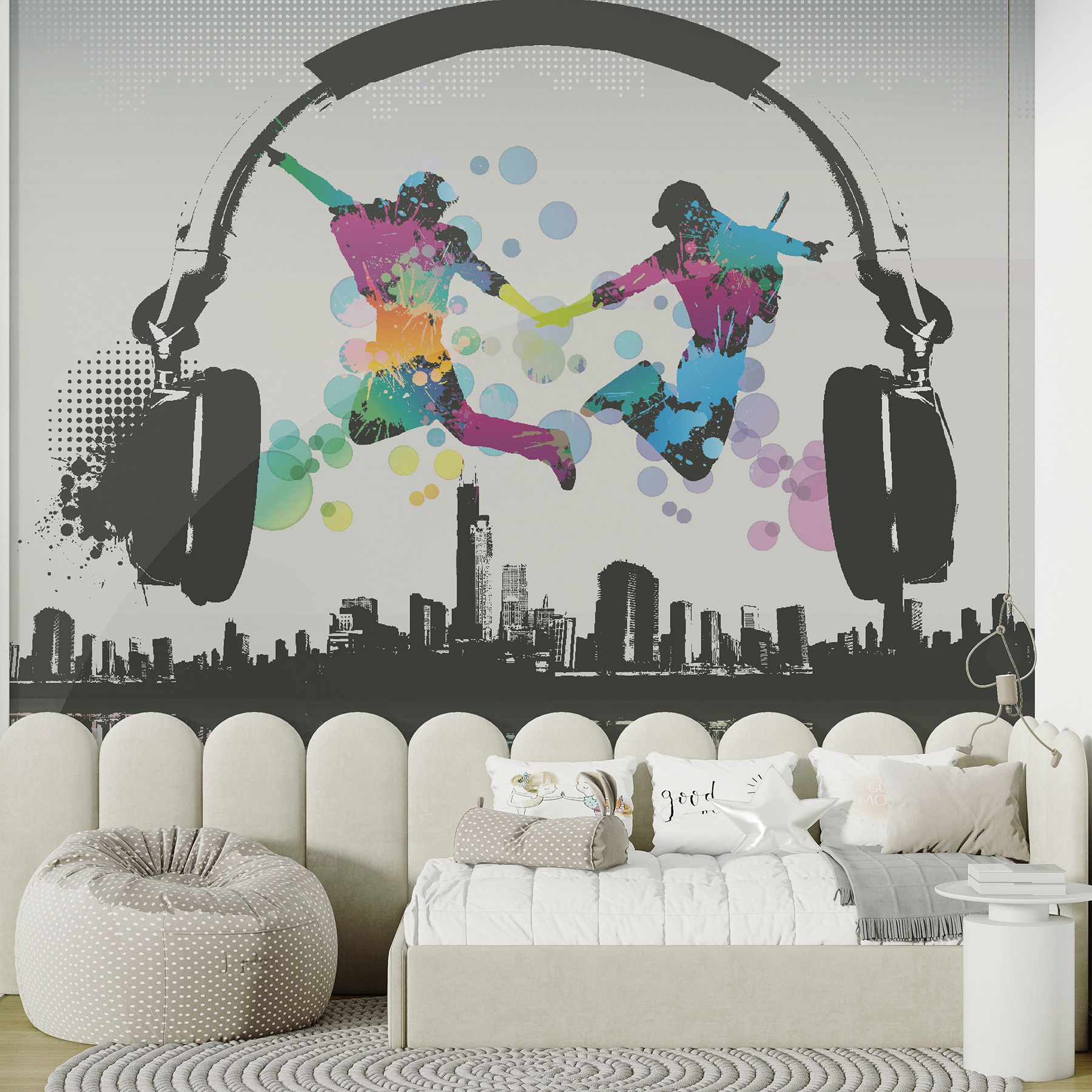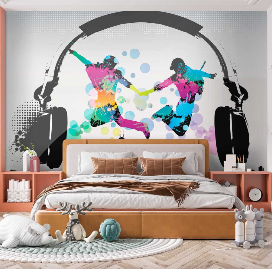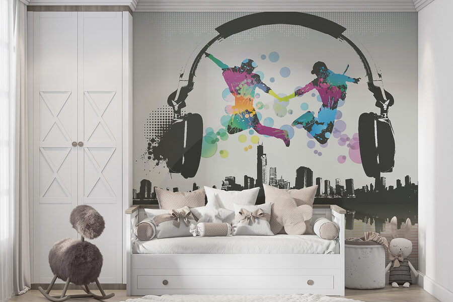 Dizajn predstavuje dve postavy, ktoré búrlivo skáču na pozadí mestskej krajiny a obrovských slúchadiel – akoby tancovali vo vlastnom rytme a pozývali každého, kto ich uvidí, aby sa pripojil k zábave. Výrazné farebné škvrny okamžite upútajú vašu pozornosť a zdvihnú vám náladu! Navyše sa nachádza v kategóriách ako “Dizajnové tapety na stenu” a “Obľúbené nástenné maľby”, takže viete, že ste sa dostali na niečo výnimočné.