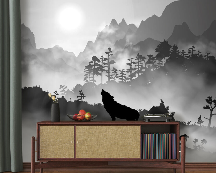 Predstavte si, že vstúpite do útulnej miestnosti, kde dominuje ohromujúca nástenná maľba vlka vyjúceho na mesiac. Nie je to len taká hocijaká nástenná maľba, je to ako poézia prírody na vašej stene. Mäkké, hmlisté hory a siluety stromov vytvárajú pokojné pozadie, ktoré upokojuje blúdiace myšlienky a navodzuje pokojnú myseľ.