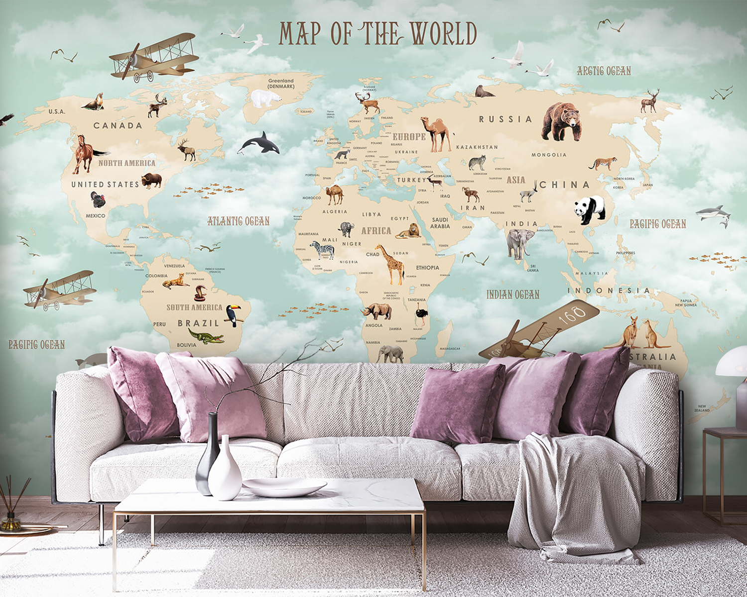Vďaka jemným zemitým tónom a pôvabným ilustráciám zvierat nie je určený len pre najmenších, ale je príjemným podnetom na rozhovor pre každého. Predstavte si to: vojdete dnu a váš pohľad spočinie na Číne s jej pandami, majestátnych orloch vznášajúcich sa nad Severnou Amerikou, aha, je tu aj Austrália so svojimi hravými klokanmi. Je to určite náučné, ale aj rozmarné pozadie, ktoré podnecuje príbehy a sny.