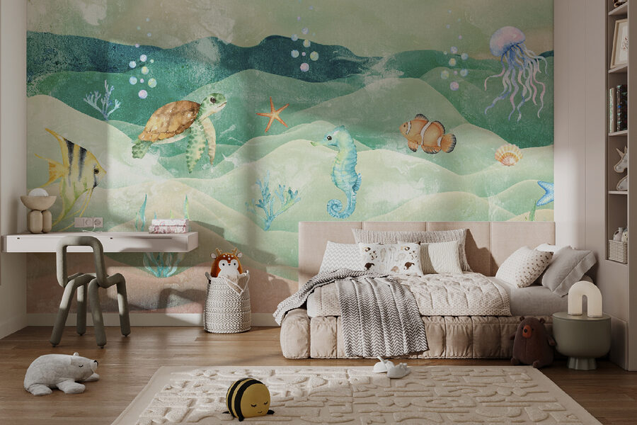 Predstavte si, že sa každý deň prebúdzate s pokojnou podmorskou scénou s touto nástennou maľbou “Akvarel plávajúcej korytnačky”. Perfektne sa hodí do každej miestnosti, ktorá potrebuje nádych rozmarnosti a zázraku – do detských izieb, herní alebo na akékoľvek miesto, ktoré túži po veselých vibráciách. Zobrazte korytnačku kĺzajúcu sa medzi živými rybami a nežnými morskými živočíchmi, ktorá na vašu stenu prinesie príval života. Táto nástenná maľba nie je len dekoráciou, ale aj bránou k podmorským dobrodružstvám. Pocíťte, ako sa nad vami rozlieva pokoj vďaka jemným akvarelovým odtieňom… je to ako ponoriť sa do denného snenia! A čo je na tom najlepšie? Deti ho absolútne milujú! Podnecuje predstavivosť a premení každý priestor na čarovný podmorský svet. Nie je to len pekné, je to celý oceán zábavy na vašej stene! Tak sa ponorte – vaše steny sa vám poďakujú.