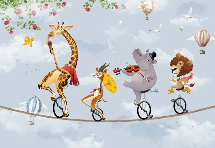 Premeňte každý detský priestor pomocou tejto rozkošnej nástennej maľby s hrochom, ktorý všetkým hrá na husliach! Predstavte si radosť zo sledovania žirafy a leva, ktorí sa na jednokolkách pridávajú k zábave. Je to rozmarná scéna, ktorá podnecuje predstavivosť a smiech. Táto fototapeta, ktorá je ideálna do spální alebo herní, ľahko oživí každú nudnú stenu a dodá jej šmrnc. Len si predstavte, ako sa malé deti každý deň chichocú, keď sa rútia do dobrodružstva – kto by sa nechcel prebúdzať do tohto radostného chaosu? Je to dokonalý doplnok, ktorý inšpiruje k tvorivosti a radosti!