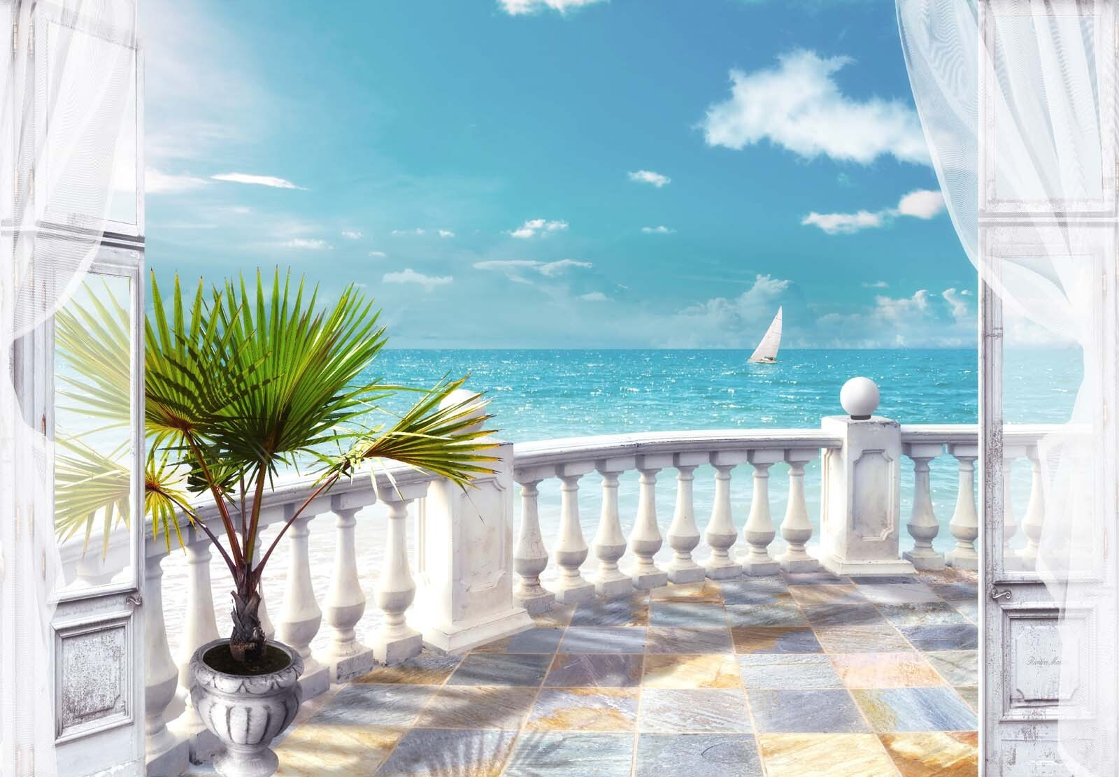 Predstavte si, že sa každé ráno zobudíte s pokojným výhľadom na more – je to ako váš osobný únik priamo domov. Táto nástenná maľba “Palma v kvetináči na balkóne” vnesie tento uvoľnený pobrežný šarm do každej miestnosti. Zdá sa, že cez otvorené dvere vanie vánok a šumí listy palmy. Vzdialená plachetnica pod nadýchanými bielymi oblakmi dodáva pokojnú atmosféru. Ideálne na trochu snenia… Už cítite slnko na tvári? Či už v domácej kancelárii, obývačke, alebo dokonca v útulnom čitateľskom kútiku, táto nástenná maľba nabáda k pokoju a pocitu nekonečných prázdnin. Spojte ju s jemnou posteľnou bielizňou alebo mušľovým dekorom, aby ste získali bezstarostnú atmosféru plážového domu – a to všetko bez piesku v topánkach!
