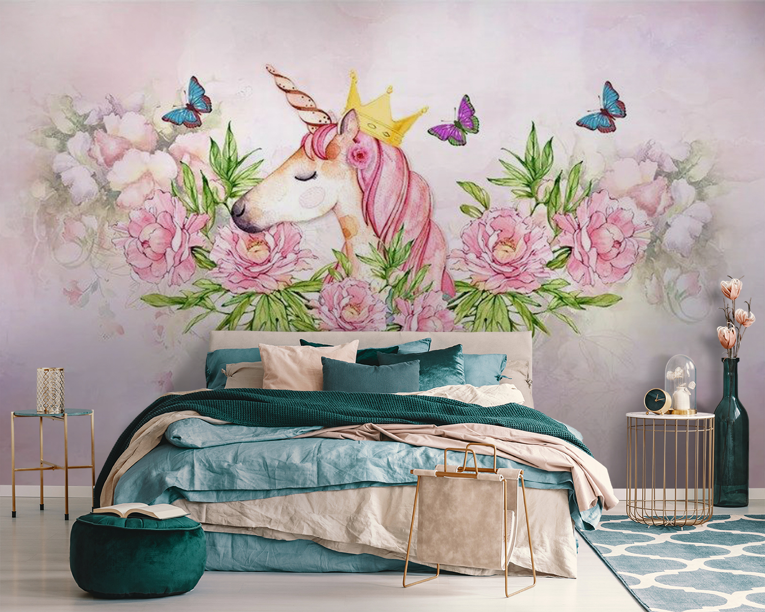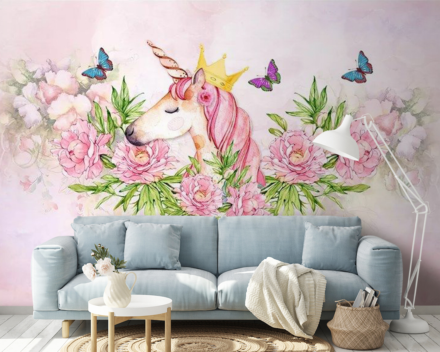 Premeňte detský priestor na čarovné kráľovstvo s touto očarujúcou fototapetou s jednorožcom s korunou a obklopeným motýľmi. Predstavte si radosť v očiach vašej dcéry, keď vojde do svojej izby a privíta ju táto rozmarná scéna. Je to ako keby rozprávka ožila priamo na stenách! Jemné farby a očarujúci dizajn vytvárajú pokojnú, ale živú atmosféru. Len si predstavte útulné chvíle pri rozprávkach alebo stretnutiach s deťmi, kde sa môže rozvíjať fantázia – nie je potrebné mať trblietavé topánky, keď táto nástenná maľba prináša všetko kúzlo! Ideálna pre každého malého snílka.
