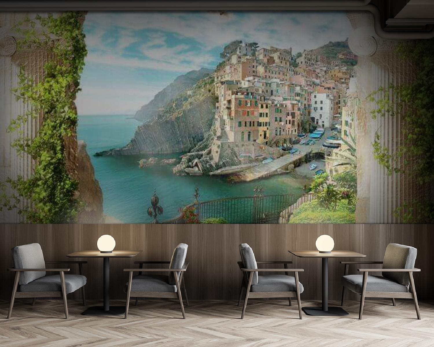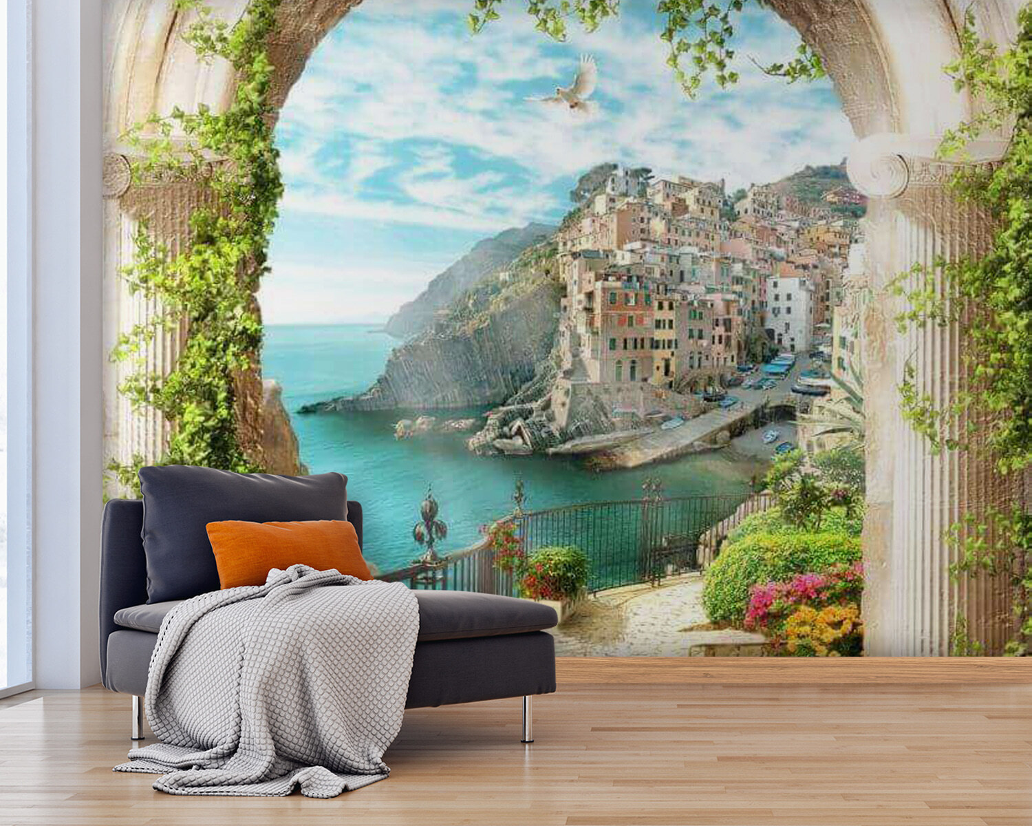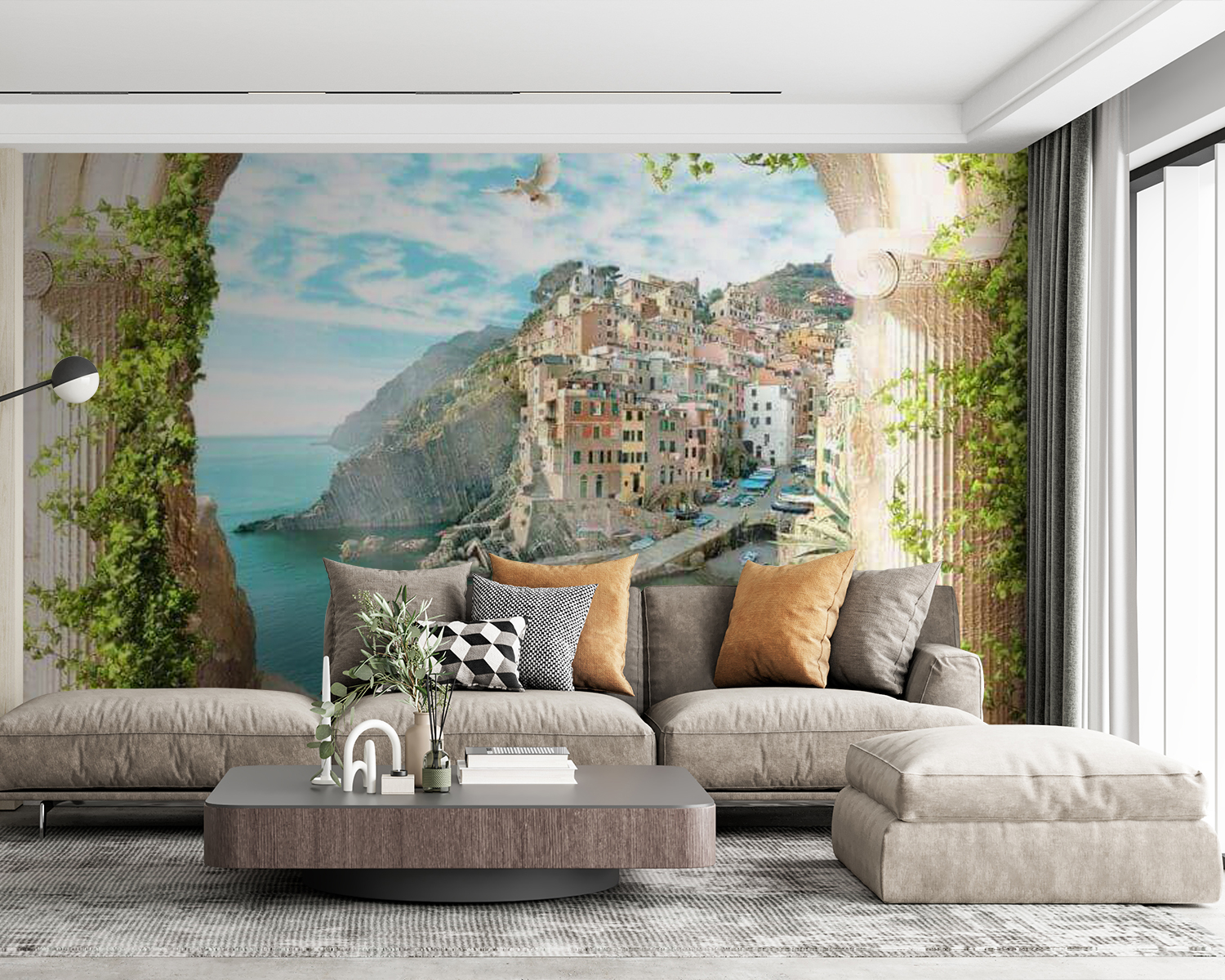 Preneste svoj priestor do vysnívaného pobrežného útočiska s nástennou maľbou “Rastlina v kvetináči”! Ach, ten výhľad – na očarujúcu prímorskú dedinku cez čarovný oblúk, zahalený do sviežej zelene. Predstavte si, ako popíjate rannú kávu a slnečné svetlo tancuje na vode… Je to ako mini dovolenka zakaždým, keď sa naň pozriete!