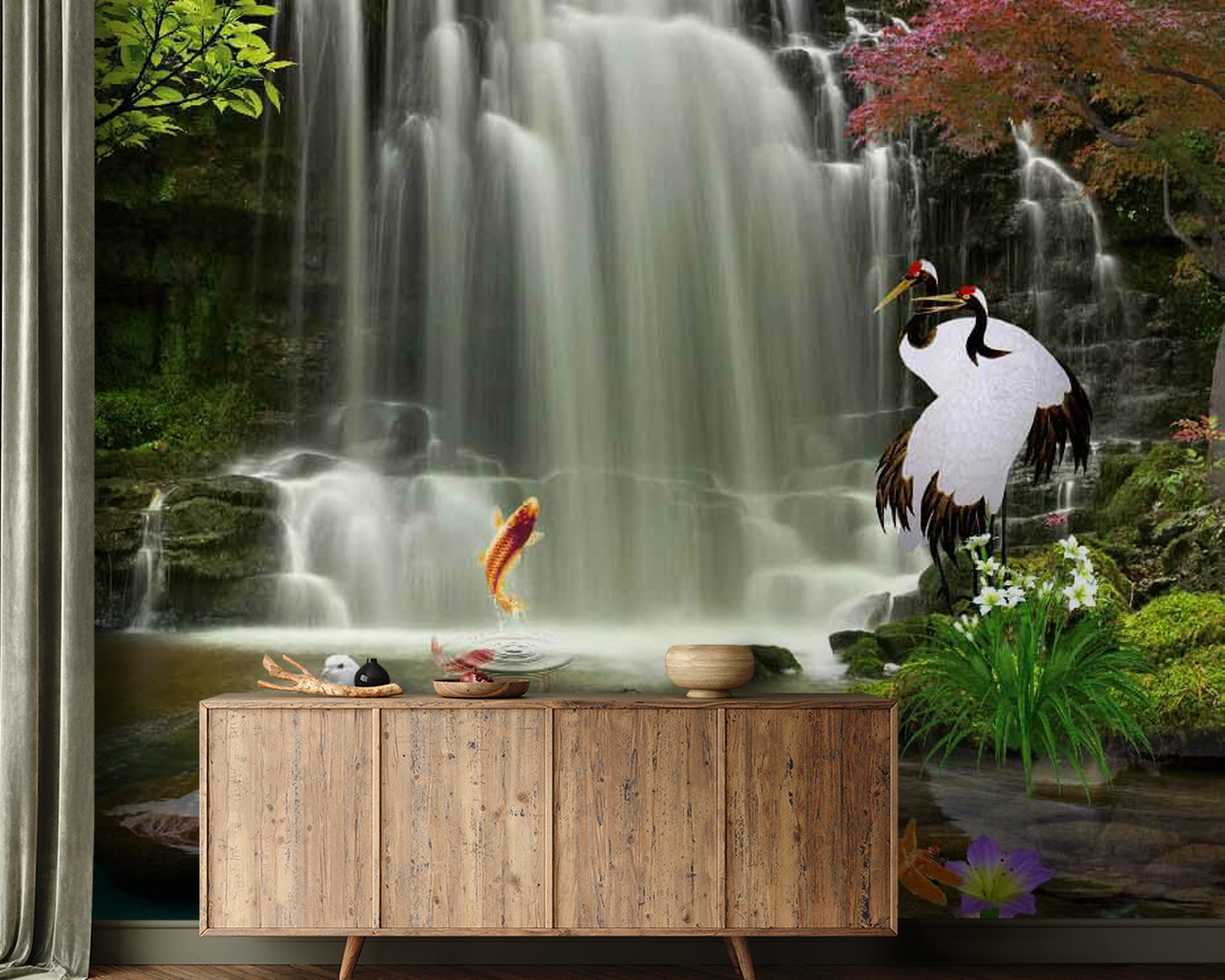 Transform any room into a serene oasis with this stunning waterfall mural. Bursting with life, it features playful koi fish, elegant birds in mid-flight, and vibrant flora that brings nature straight to your walls. Picture this: a cozy reading nook where the calming sound of cascading water fills your mind, while the rich greens and soft blues whisk you away to a tranquil retreat. It’s like having a mini-vacation at home—no plane ticket needed. Perfect for those who appreciate beauty and serenity, this mural adds a touch of whimsy and wonder that’ll make you smile every time you walk by. Trust it to brighten up any dreary day!