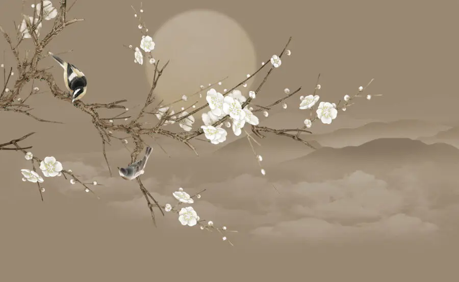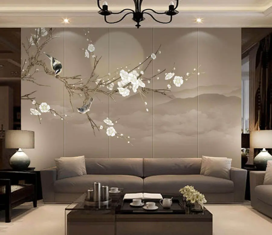 Videli ste túto nástennú maľbu? Volá sa “Vták na konári” a je to priam rozkošné! Predstavte si, že sa vaša stena premení na tento pokojný výjav – dva vtáčiky, ktoré sa len tak pohodili na rozkvitnutej vetve. Jemné béžové pozadie jej dodáva snový, takmer mystický nádych, akoby ste sa preniesli do pokojnej záhrady.