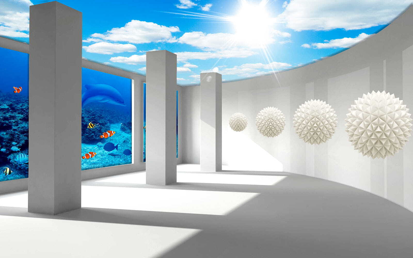 Premeňte akúkoľvek miestnosť na rozprávkový podmorský raj s touto úžasnou nástennou maľbou. „Miestnosť so stĺpmi a rybami“ vás pozýva ponoriť sa do oceánu pokoja, kde plávajú hravé ryby a slnkom osvetlené vlny tancujú vo vašom priestore. Predstavte si, ako ležíte vo svojej obývačke a máte pocit, ako keby ste plávali v upokojujúcom mori. Je to ako dovolenka pre vaše steny! Táto tapeta je ideálna pre každého, kto chce uniknúť z bežného života, a dodá vašej izbe farbu a príjemnú atmosféru. Vaši priatelia si možno budú myslieť, že ste si najali konzultanta pre umenie s námorníckou tematikou! Ponorte sa a nechajte svoju fantáziu voľne plávať.