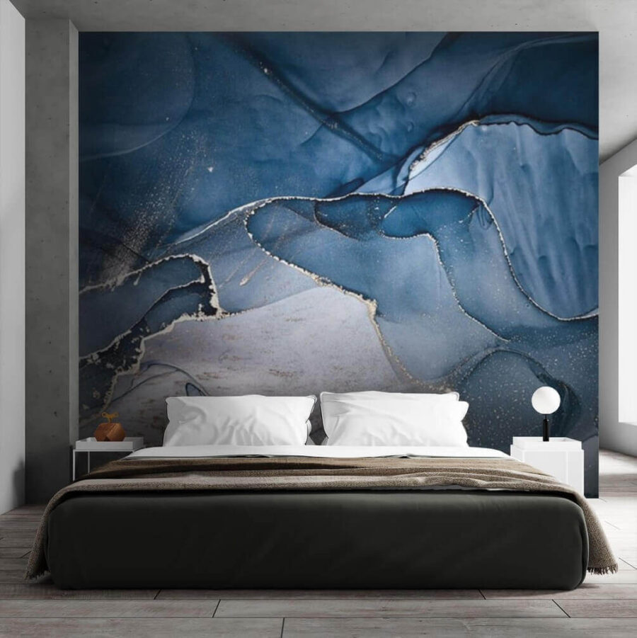 Pomocou nástennej maľby “Abstraktné modré vlny” premeníte akúkoľvek stenu na upokojujúci únik. Predstavte si, že vstúpite do miestnosti, v ktorej sa víria upokojujúce odtiene tmavomodrej farby ako jemný príliv, ktorý obmýva pobrežie. Táto nástenná maľba nepokrýva len stenu, ale pozýva do vášho priestoru pokoj.