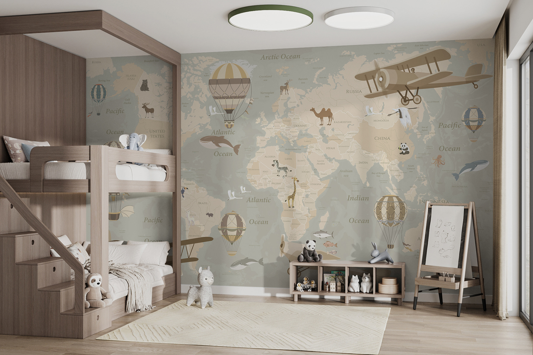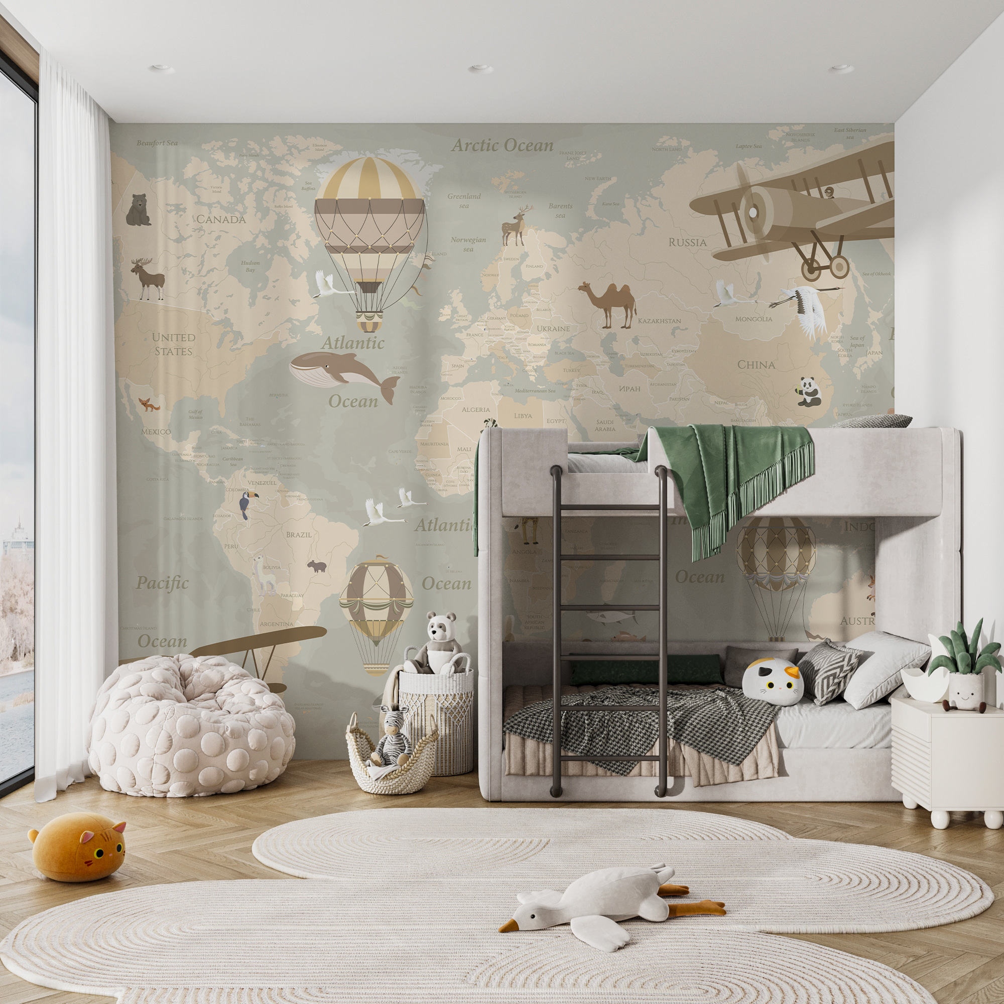 Predstavte si, ako sa váš malý objaviteľ vydáva na imaginárne dobrodružstvá – jeden deň letí dvojplošníkom nad Afrikou a na druhý deň sa vznáša v teplovzdušnom balóne nad Austráliou. Je ideálny na vzbudenie zvedavosti a premenu stien na plátno snov. Navyše má túto krásnu vintage atmosféru, ktorú môžu oceniť aj dospelí – ako umelecké dielo a lekcia zemepisu v jednom. Rozmarný a zároveň náučný, vďaka ktorému sa každý pohľad stane mini dovolenkou. Tak prečo sa uspokojiť s obyčajnými stenami, keď môžete mať celý svet, ktorý čaká na preskúmanie?