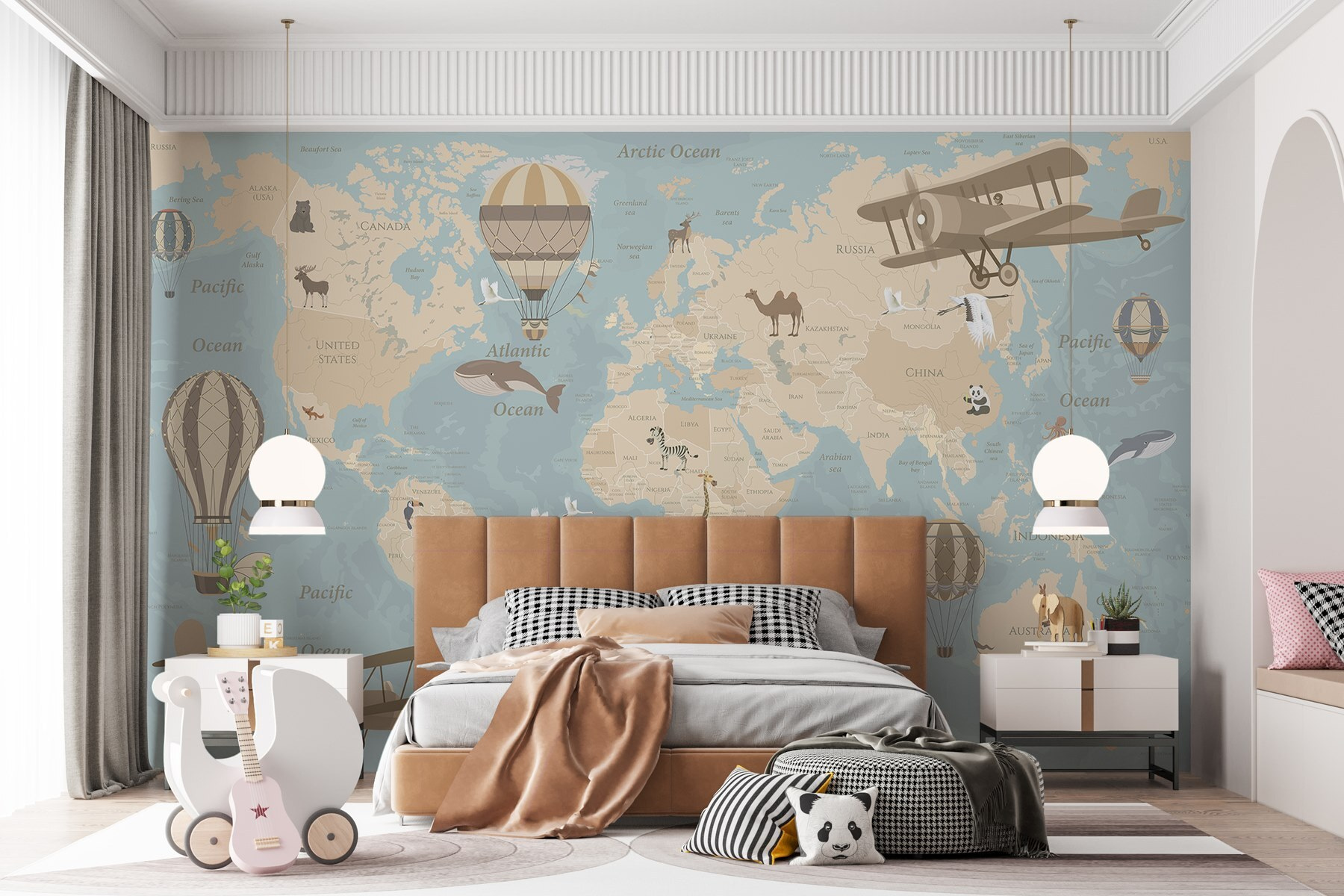 Premeňte svoj priestor pomocou tejto očarujúcej nástennej maľby mapy sveta plnej rozmarných lietadiel a teplovzdušných balónov. Je to ako pozvánka na dobrodružstvo priamo na vašej stene! Predstavte si lenivé víkendy strávené vymýšľaním cestovateľských plánov alebo zdieľaním príbehov o ďalekých krajinách s priateľmi, a to všetko pri pohľade na útulné ilustrácie veľrýb a hravých pánd.