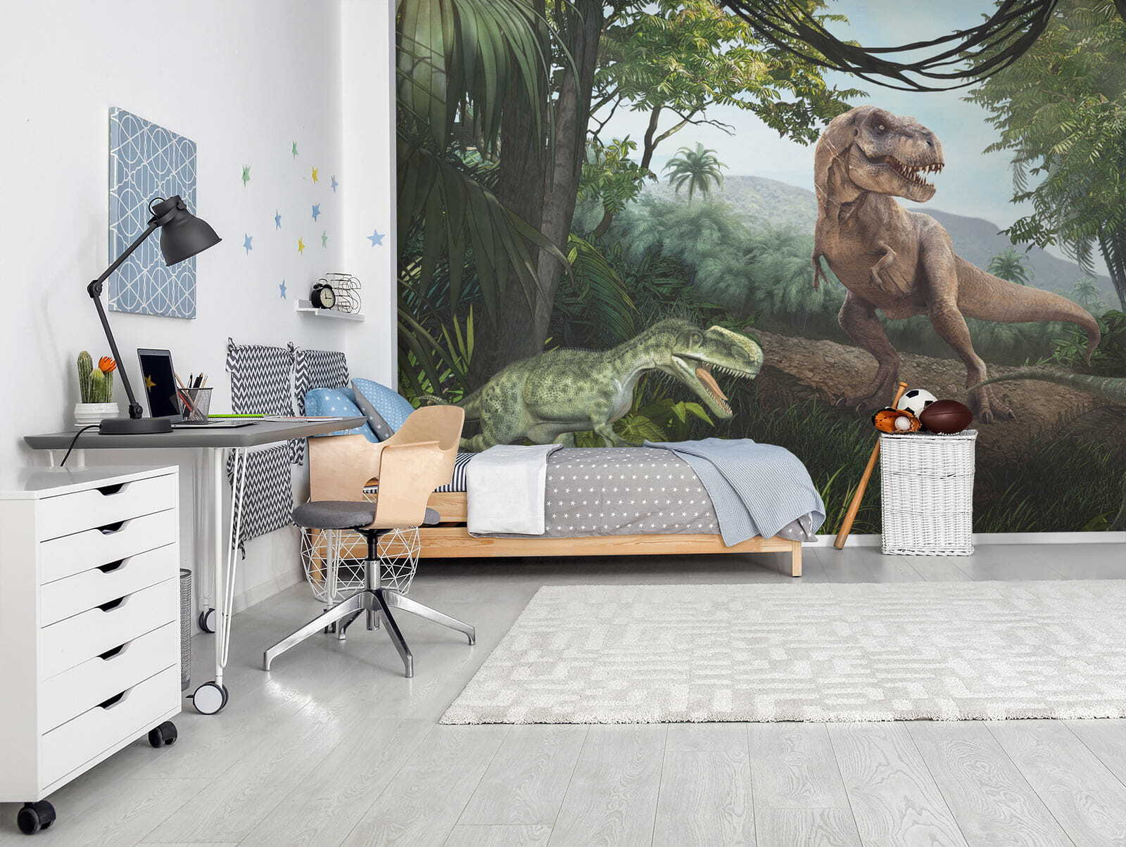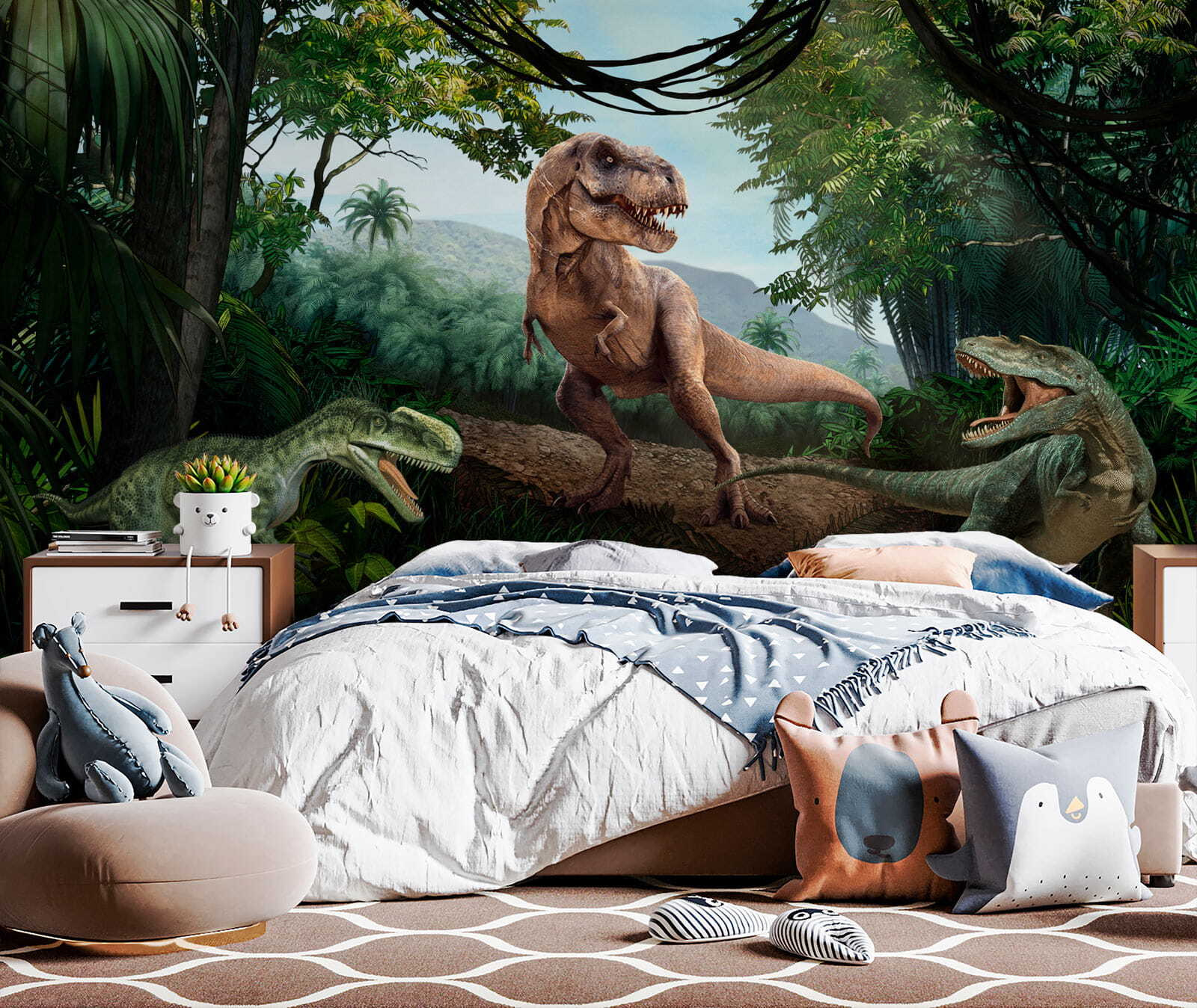 Je vaše dieťa posadnuté dinosaurami? Alebo možno len radi meníte nudné steny na konverzácie, pri ktorých vám padá čeľusť? Vydajte sa do jury s touto živou, realistickou nástennou maľbou – je to ako váš osobný stroj času! Predstavte si, že sa každý deň budíte s T-Rexom (samozrejme, bez tej strašidelnej časti). Perfektne sa hodí do detských izieb, herní alebo aj do nepredvídateľnej domácej kancelárie – okamžite zlepší náladu. Jeho 3D efekt prináša úžasný pocit hĺbky, takmer akoby ste mohli vstúpiť priamo do týchto bujných džunglí. Ste pripravení rozpútať prehistorické kúzlo? Rawr-some!