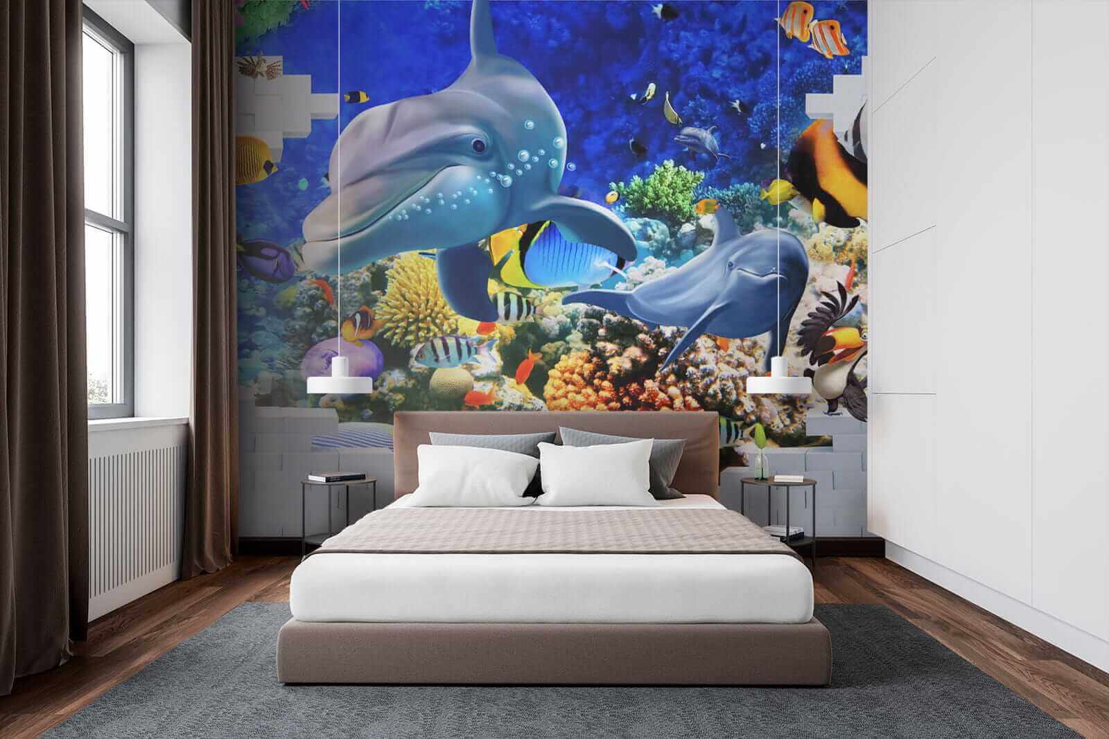 Ponorte sa do živého podmorského sveta s touto nástennou maľbou rýb a hravých delfínov, ktorá prinesie kúsok mora priamo do vášho domova. Predstavte si, ako vstúpite do svojej izby a pocítite upokojujúcu atmosféru oceánu. Živé farby tancujú okolo vás – od drzých klaunov až po elegantné delfíny, ktoré sa usmievajú zo všetkých síl. Je to viac než len dekorácia; je to ako mať kúsok hlbokého modrého mora na dosah ruky. Ideálne do detskej izby, útulnej pracovne alebo kdekoľvek, kde by sa hodil veselý akcent. Úprimne, kto by nechcel mať delfína za spolubývajúceho? Nech vám táto nástenná maľba každý deň pripomína zázrak oceánu, bez neoprénu!