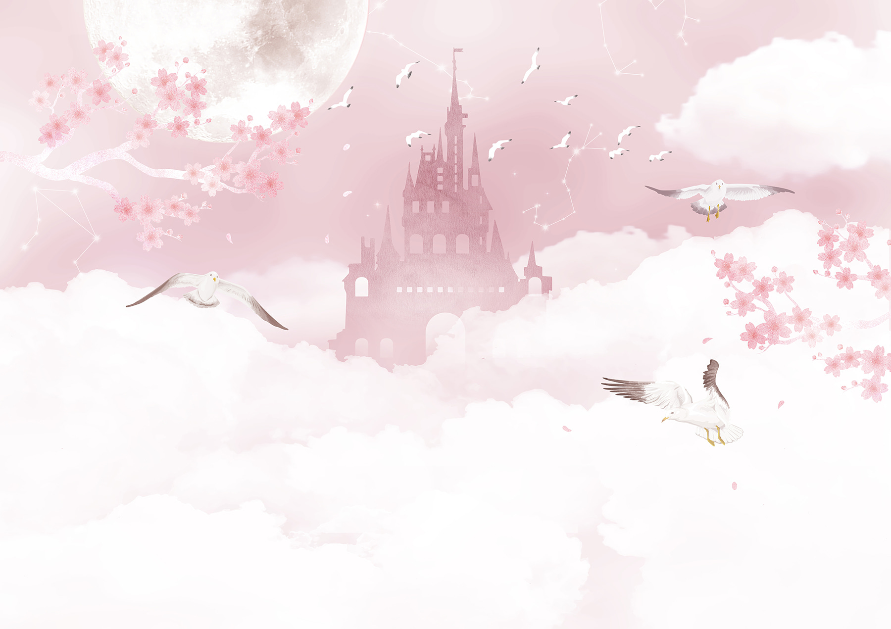 Pozrite si túto zasnenú “Nástennú maľbu Biely vták letiaci na oblohe” – je to ako vstúpiť do rozmarnej fantázie! Ideálna do detských izieb, najmä ak vaše dieťa miluje rozprávky a čarovné výjavy. Predstavte si to: mäkké, nadýchané obláčiky, vtáky vznášajúce sa slobodou, čarovný hrad v pozadí a jemné čerešňové kvety… Je to ako oživená rozprávka na dobrú noc.