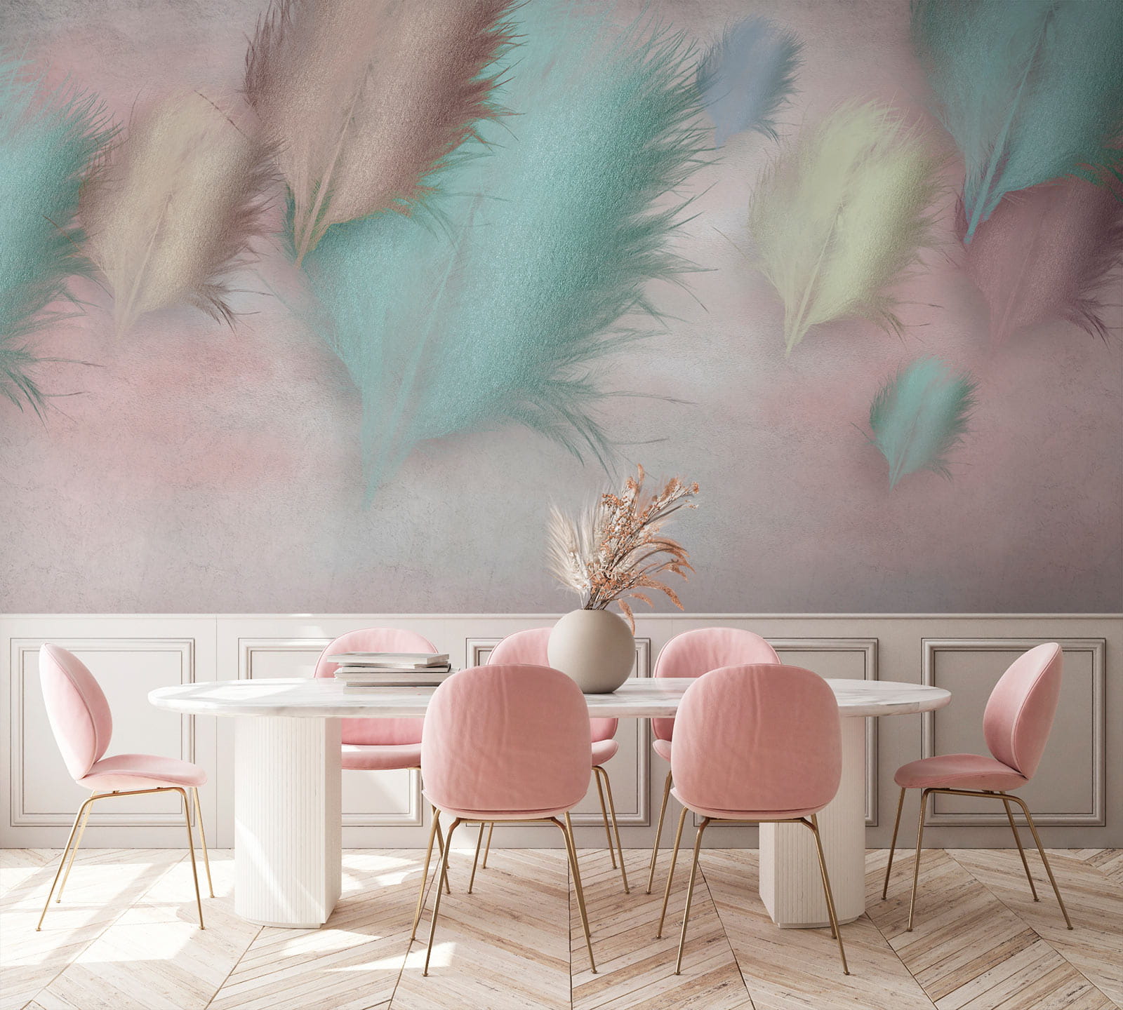 Premeňte akúkoľvek miestnosť na útulné útočisko s touto rozprávkovou tapetou „Skupina pierok na ružovom pozadí“. Je to ako obaliť svoj priestor jemným pastelovým objatím. Každé pierko ľahko tancuje na ružovom plátne a vyvoláva myšlienky na jemný vánok a lenivé popoludnia. Predstavte si, ako popíjate čaj alebo kávu a vychutnávate si upokojujúcu atmosféru – možno si dokonca predstavujete hlboké rozhovory so stenou. Ideálne pre detské izby, salóniky alebo kdekoľvek, kde je potrebný náznak pokoja. Táto tapeta nie je len dekoráciou, je to malý únik priamo vo vašej domácnosti!