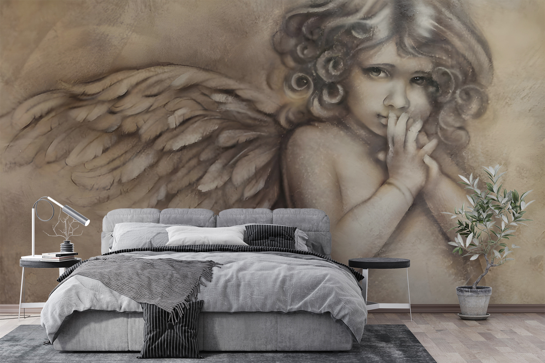 Chceli ste niekedy na svojich stenách cítiť rozmar? Zoznámte sa s fototapetou “Zamyslený anjel s mäkkými krídlami”. Je ako jemný povzdych bezveterného popoludnia zachytený v umení. Tento anjel, premýšľajúci o hlbokých myšlienkach s tými nádherne jemnými krídlami, pozve do každej miestnosti teplo a harmóniu.