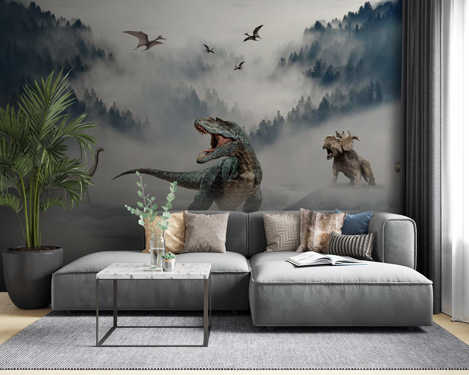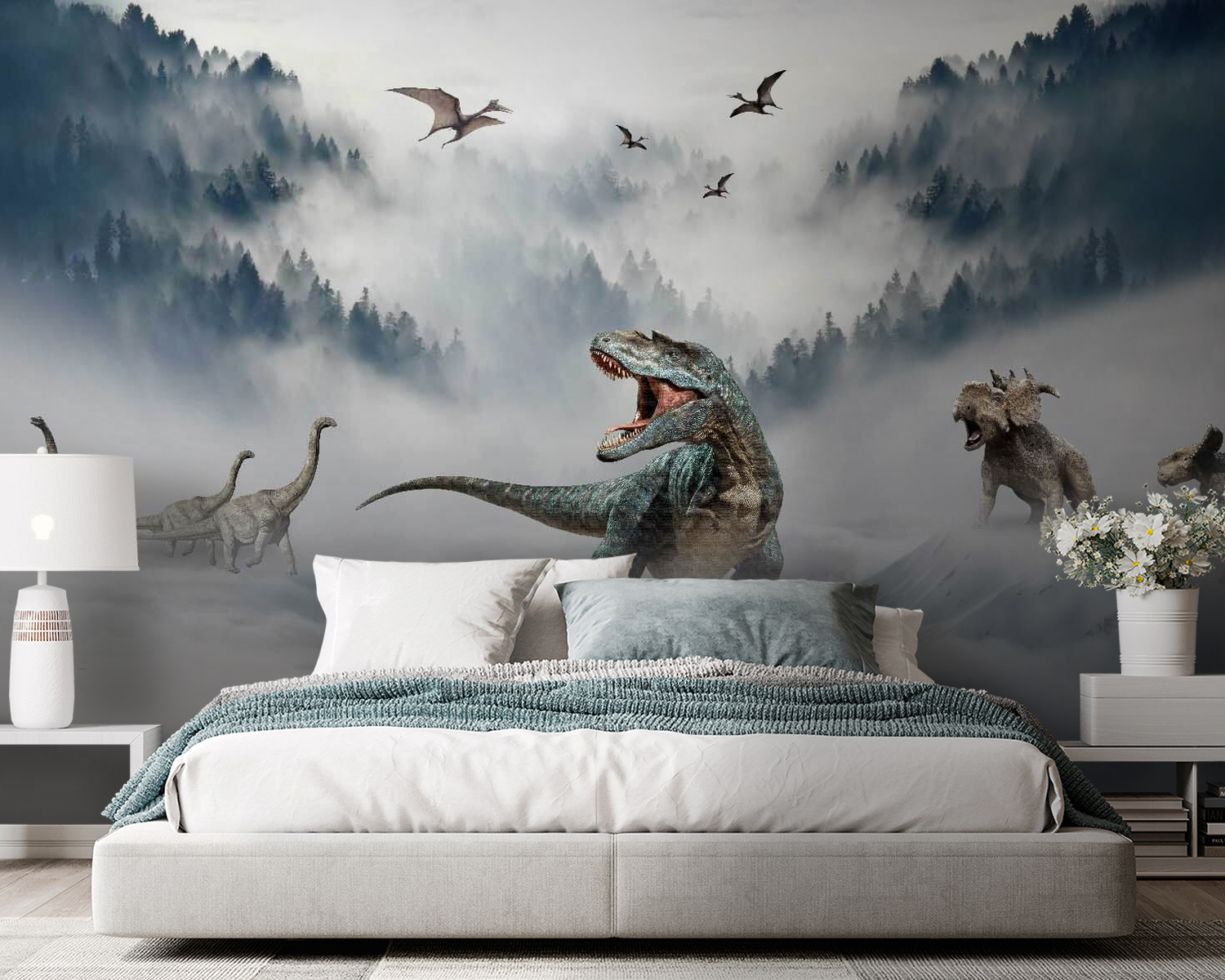 Máte doma nadšenca do dinosaurov? Táto nástenná maľba “Dinosaurus s otvorenou papuľou” im možno vyrazí dych! Predstavte si to: divoký T-Rex revúci uprostred hmlistých, hustých lesov, s dlhokrkými kamarátmi a lietajúcimi prehistorickými kamarátmi vznášajúcimi sa v pozadí. Ideálny do detských izieb, herní alebo pre každého, kto má rád trochu jurského napätia vo svojom interiéri. Predstavte si, ako malí návštevníci zalapajú po dychu od úžasu – a hravý rev, ktorý bude nasledovať! Táto nástenná maľba nie je len stena, je to dobrodružstvo, ktoré čaká na svoju príležitosť. Je odvážna, divoká a pripravená preniesť vás späť v čase! 🦖🌲