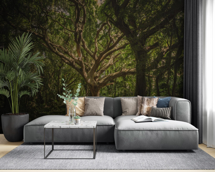 Premeňte akýkoľvek priestor na pokojné útočisko s touto ohromujúcou nástennou maľbou, na ktorej je vyobrazený veľký strom uprostred bujného lesa. Sýte zelené a zemité hnedé farby navodzujú pocit pokoja, vďaka čomu aj tie najmenšie miestnosti pôsobia ako teplé objatie prírody. Predstavte si, že sa prebudíte a privíta vás jemné šušťanie lístia, ako keby príroda usporiadala tanečnú párty. Táto tapeta je ideálna do útulných kútikov alebo domácich kancelárií a šepká: „Relaxujte, ste v lese!“ Navyše je to skvelý spôsob, ako si priniesť prírodu dovnútra – bez toho, aby ste sa museli zaoberať komármi. Oživte svoje steny a nechajte svoj interiér dýchať!