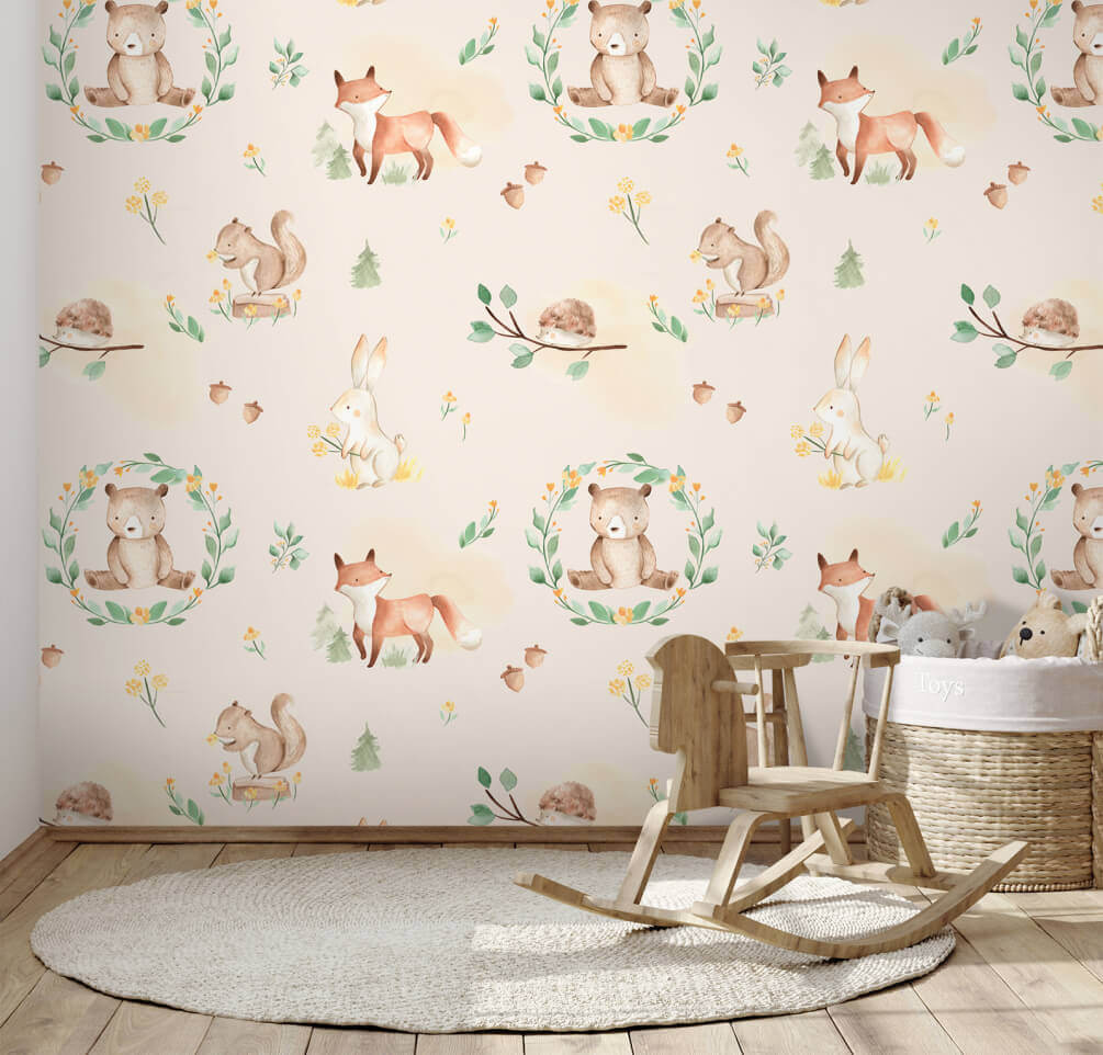 Premeňte detskú izbu na rozprávkový les s touto úžasnou nástennou maľbou „Vzory zvierat a rastlín“. Predstavte si zvedavú líšku, hravú veveričku a ospalého ježka, ako tancujú po stenách, všetko v jemných, snových akvarelových farbách. Je to ako priniesť les dovnútra – tak útulné! Ideálne na rozvíjanie fantázie, pozýva malých dobrodruhov, aby snívali o dobrodružstvách. A tá jemná farebná paleta? Je príjemná na pohľad a vytvára pokojné pozadie pre rozprávky na dobrú noc. Kto by nechcel zaspávať obklopený roztomilými zvieratkami? Len si predstavte ten smiech a sladké sny, ktoré čakajú na svoje naplnenie!